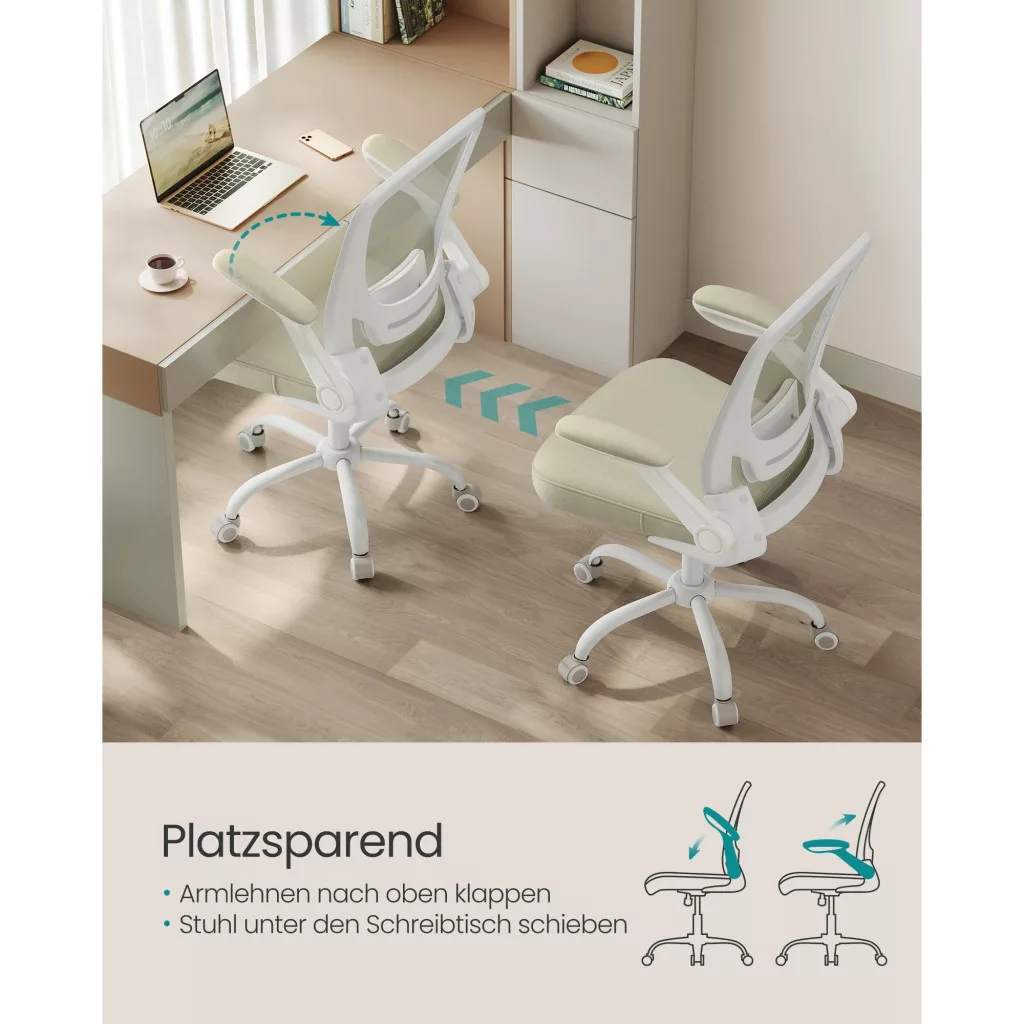 Állíthatóság és hintázás: Az ülés és a deréktámasz magassága állítható; a karfák felhajthatók, így a széket az asztal alá tolhatod, amikor nincs használatban; aktiválhatod a hintázási funkciót is (90°-105°) a pihenéshez.