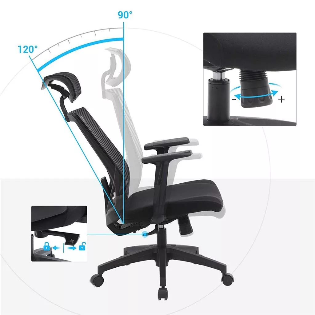 Fokozatmentesen állítható háttámla: Állítsd be a háttámla szögét 90° és 120° között. Rögzítsd a számodra megfelelő szögben, és dőlj hátra elégedetten. A rugalmas háttámlának köszönhetően könnyedén válthatsz a munka és a pihenés fázisai között.