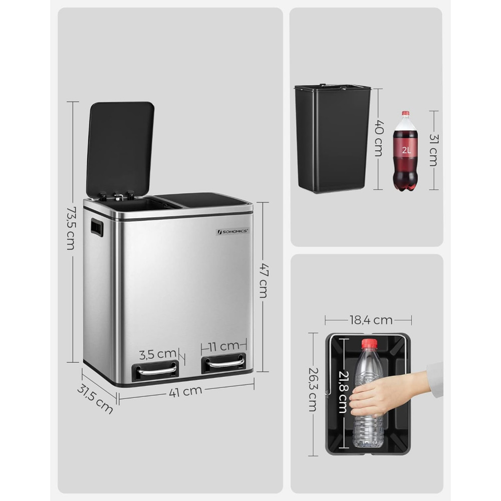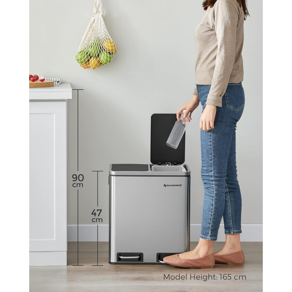 SONGMICS Konyhai szelektív szemetes kuka, 2 x 15L, pedálos, acél, 41x31x47cm, ezüst és fekete