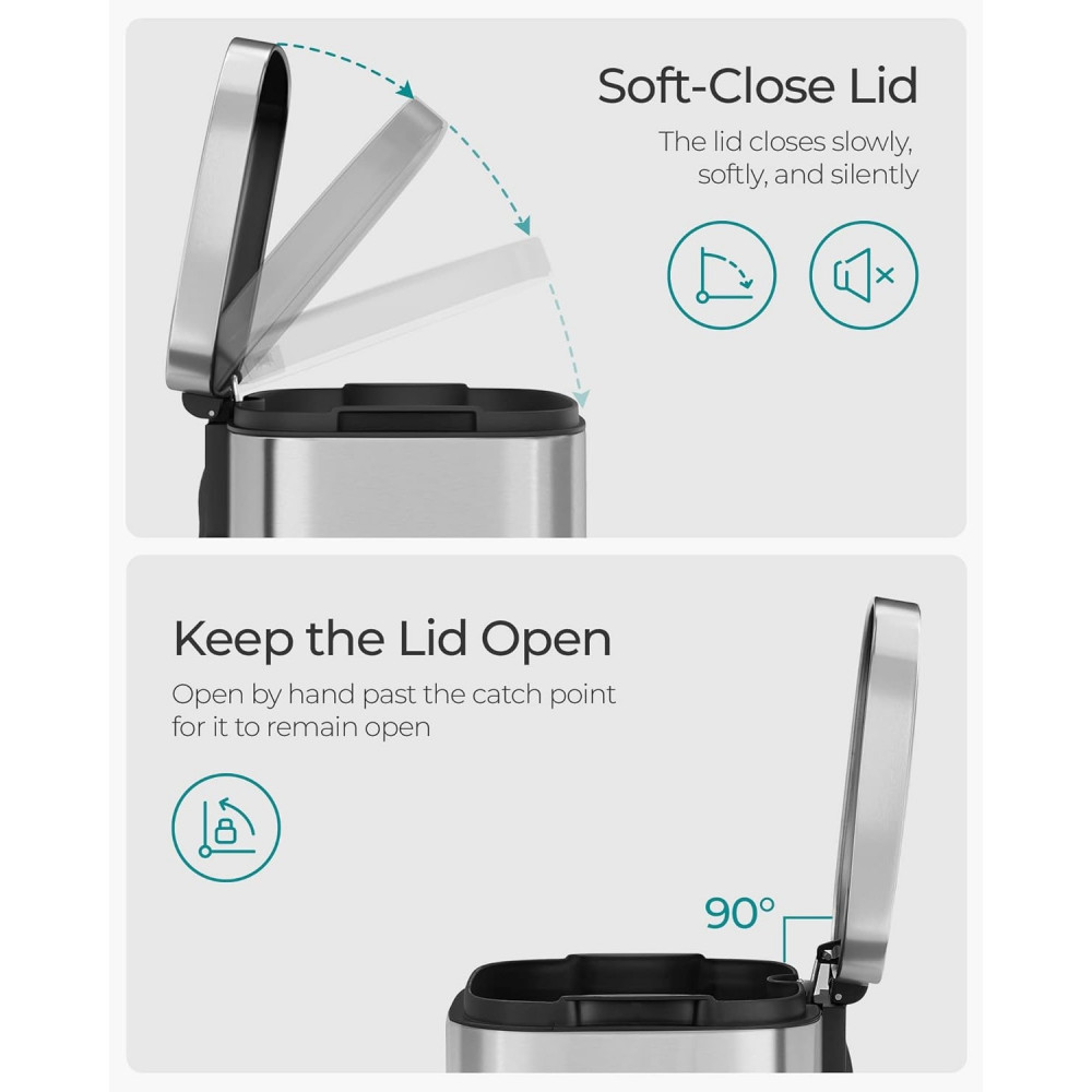Kétféleképpen nyílik: Egyszerűen lépjen a pedálra, hogy gyorsan kinyissa a kuka fedelét és kidobja a hulladékot. A fedél kézzel teljesen kinyitva nyitva is tartható.