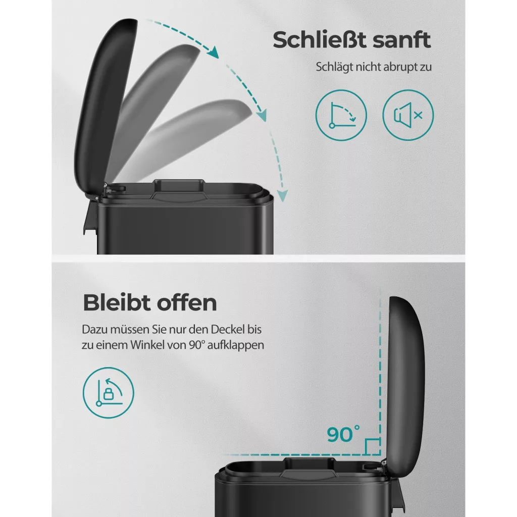 Van Egy Lágy Oldala: Bár merev fém külsővel készült, a szemetes gyengéd—a pufferműködésnek köszönhetően a fedél halkan, lassan és csendesen záródik, anélkül, hogy hangos csattanás lenne