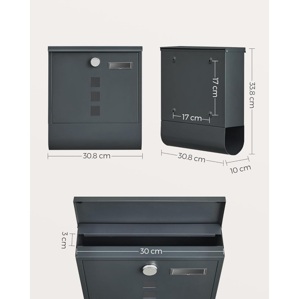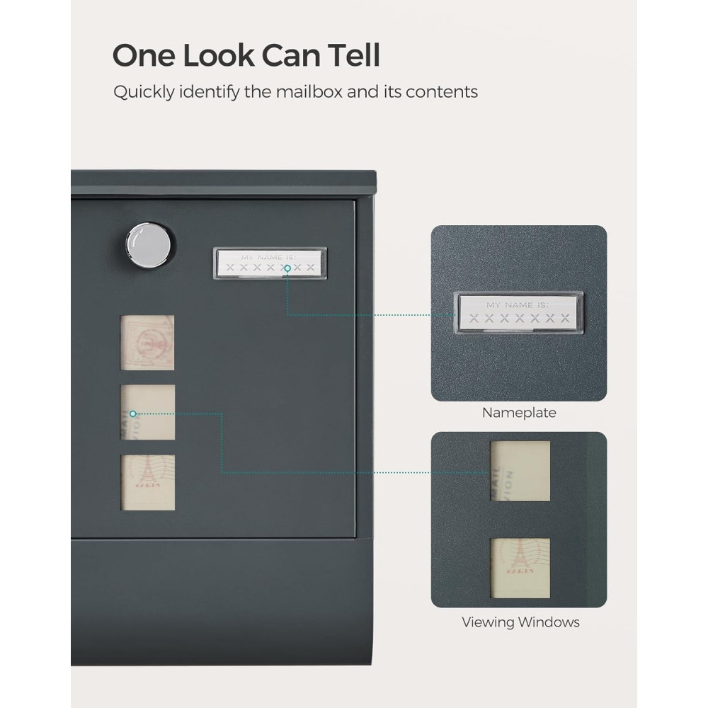 SONGMICS Zárható postaláda újságtartóval, névtáblával falra, kerítésre szerelhető, antricit szürke