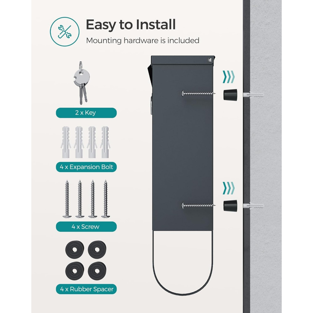Könnyű Telepítés: Nem kell keresgélned, hogyan kell felszerelni egy postaládát; a mellékelt csavarokkal, táguló csavarokkal és gumitávtartókkal könnyedén felakaszthatod ezt a stílusos levélszekrényt a bejárati ajtód vagy a veranda közelében, készen állva a beérkező levelek fogadására.