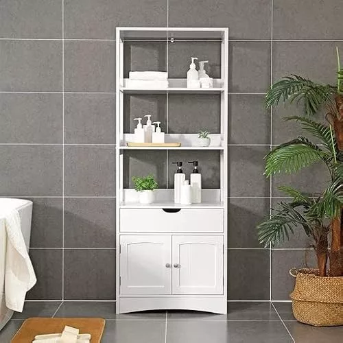 VASAGLE Álló fürdőszoba szekrény fiókkal és szerkénnyel, 3 polccal, fehér, 60 x 32 x 154 cm
