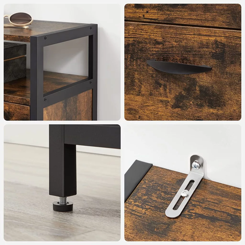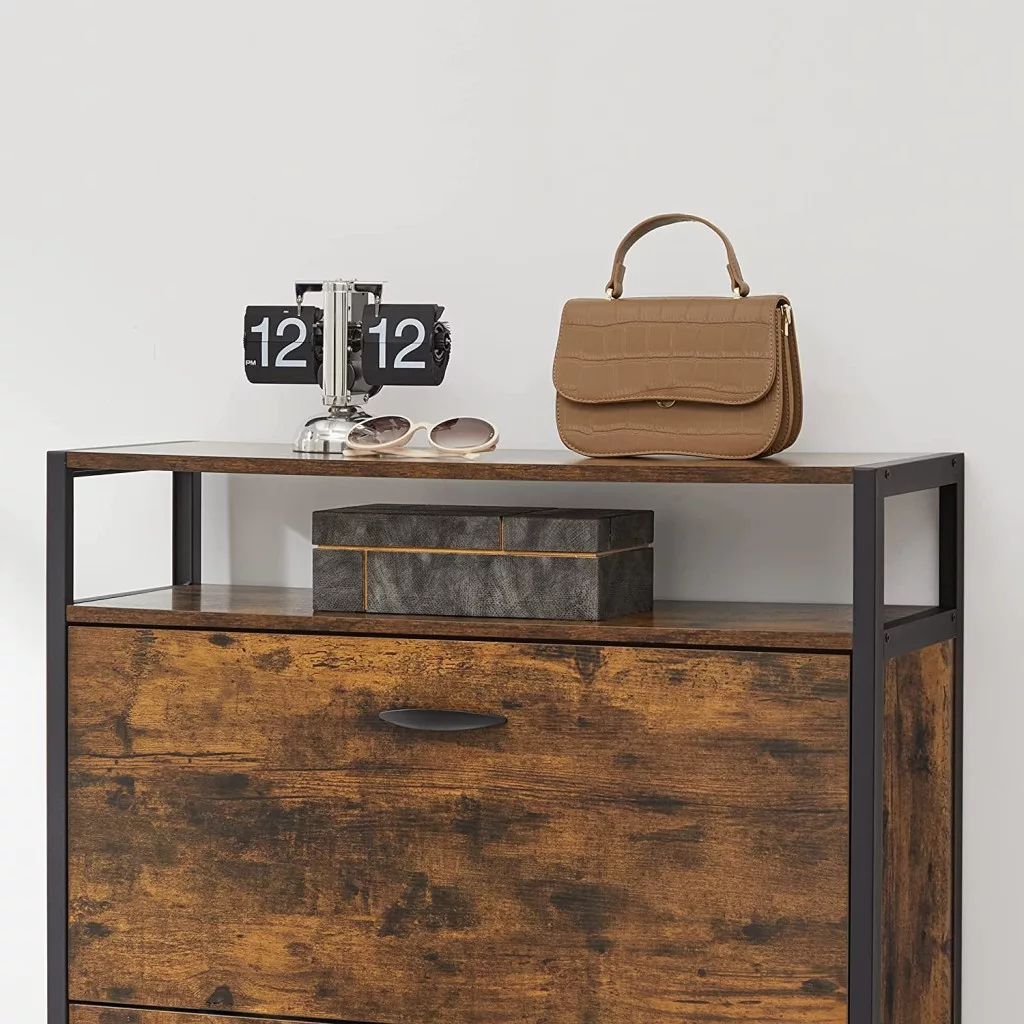 Lenyűgöző stílus: A stílusnak egy cipősszekrényben is jelen kell lennie. A rusztikus barna forgácslap és a fekete acélkeret keveréke elegáns ipari érintést biztosít, amely lenyűgözi vendégeidet.