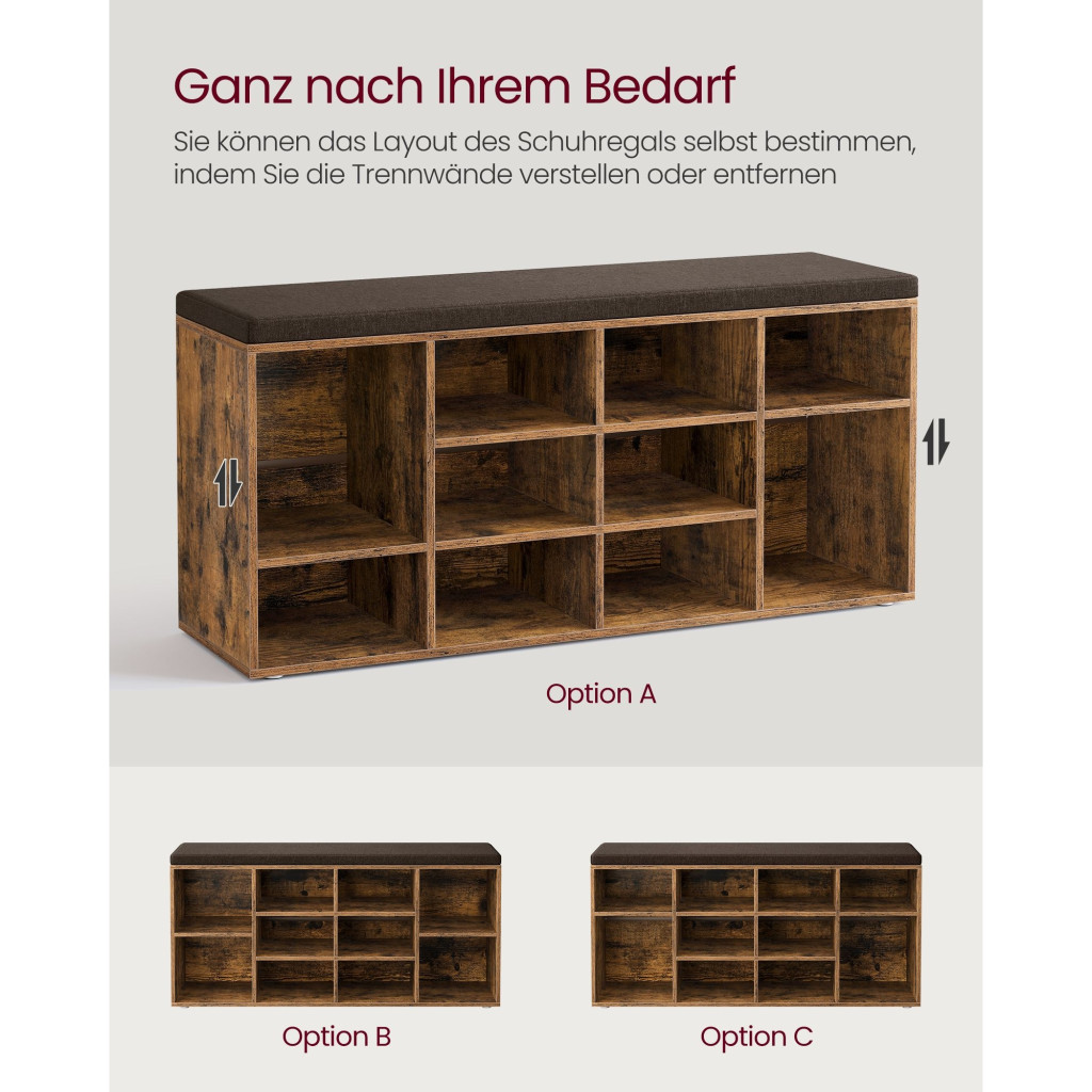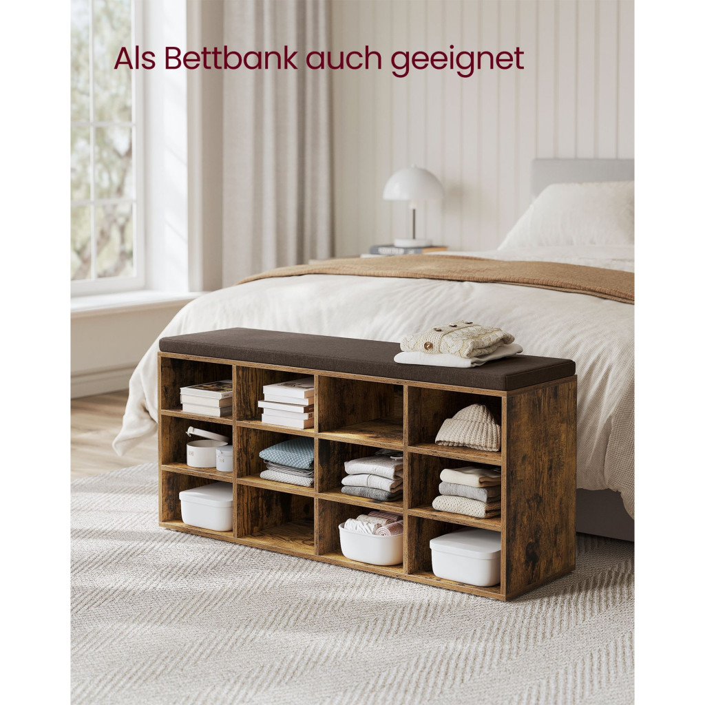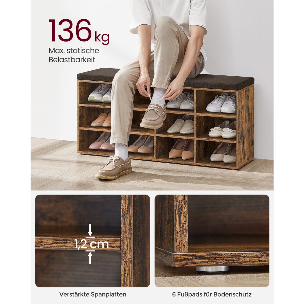 VASAGLE Cipőtároló pad, 12 rekesszel, párnázott ülőfelülettel, rusztikus barna 104x30x48cm