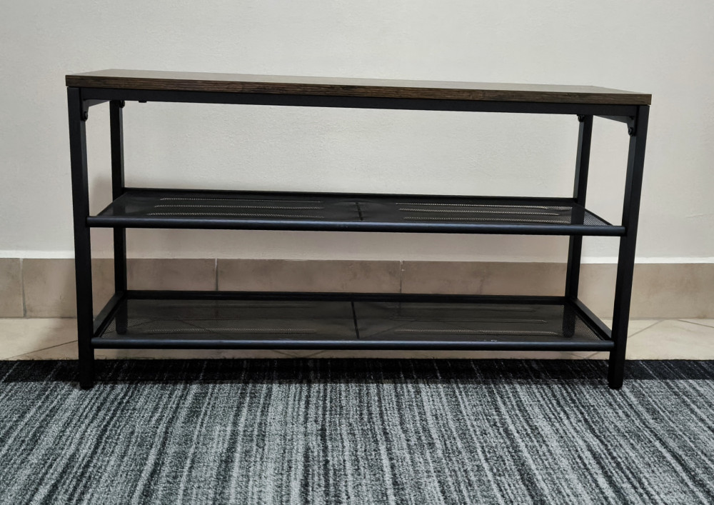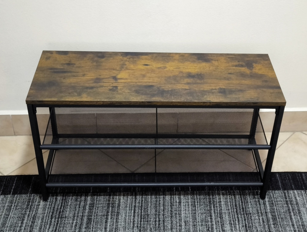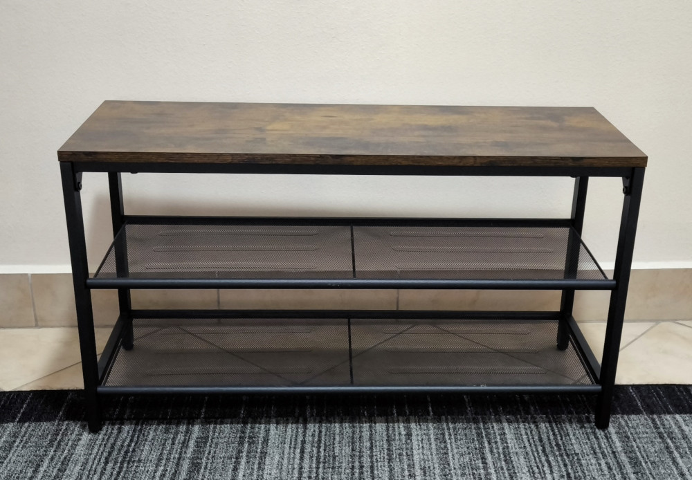 Triple-Bónusz: Egy padot kap egy stílusos, rusztikus-barna felülettel, egy cipőtartót 2 fekete hálós polccal, és egy dekoratív darabot a bejárati területére, amelyet a divatos ipari stílus jellemez.