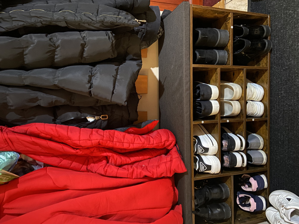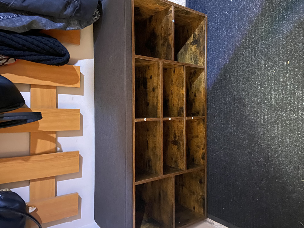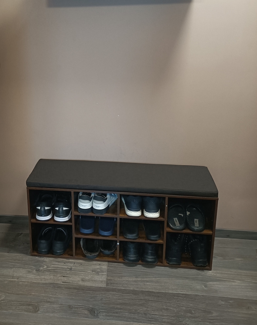 Nézz másodszor is: Fényes fekete műbőr és 2 sűrű hálós acélrács polc a cipőknek, amelyeket egy rusztikus barna felület koronáz meg – ezen a cipőpadon valóban sok felfedeznivaló van