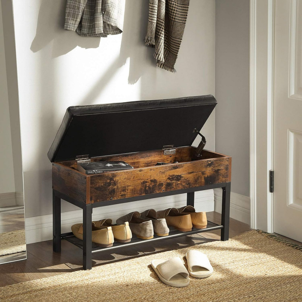 Miből készült ez a pad? Egy kényelmes pad puha szintetikus bőr huzattal, elegáns cipőtartó acél vázzal, és egy stílusos tárolási lehetőség rusztikus elemekkel