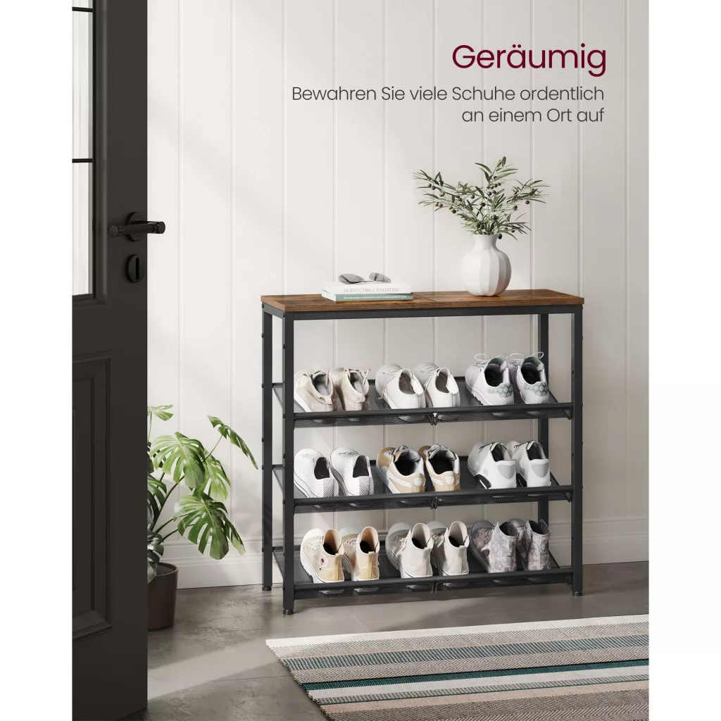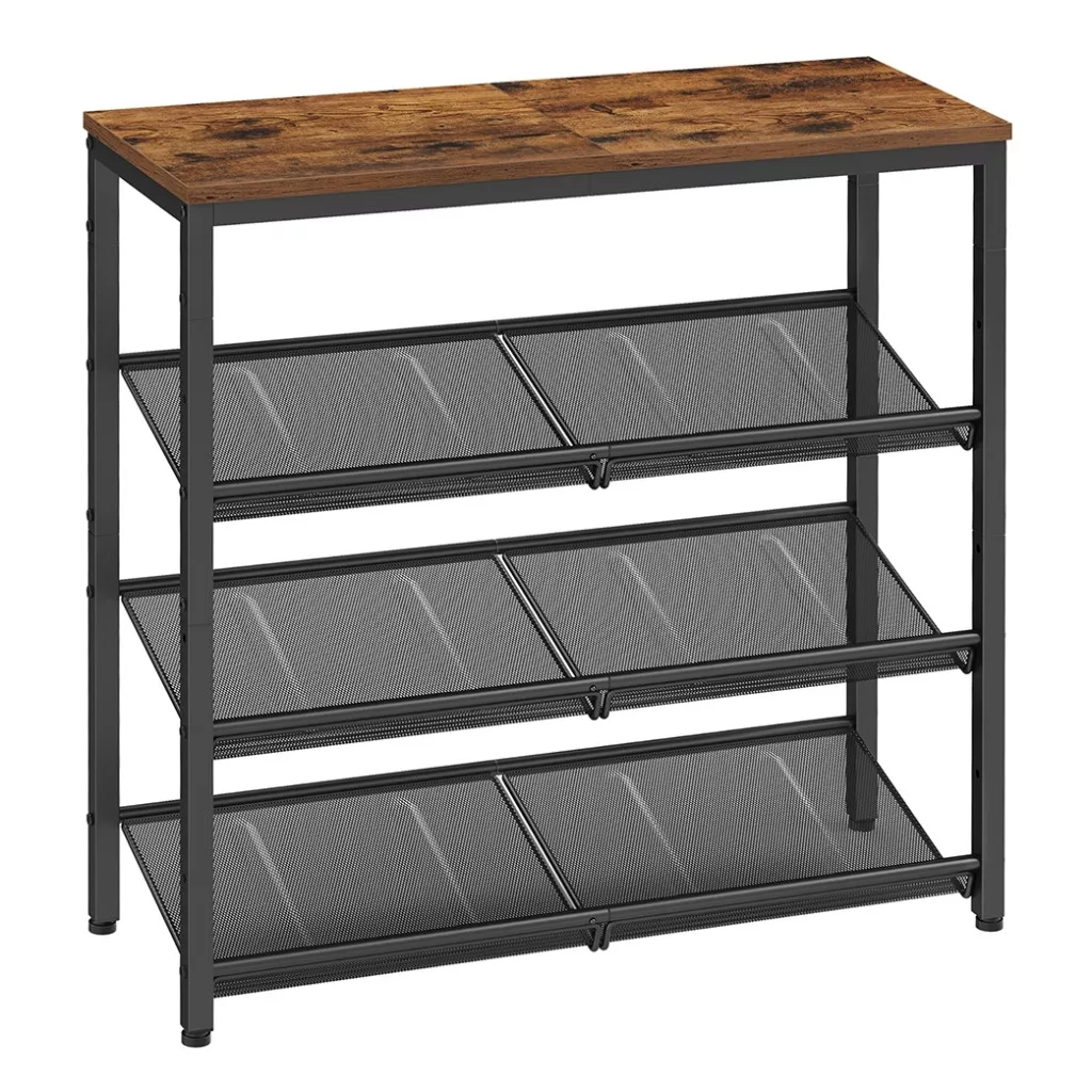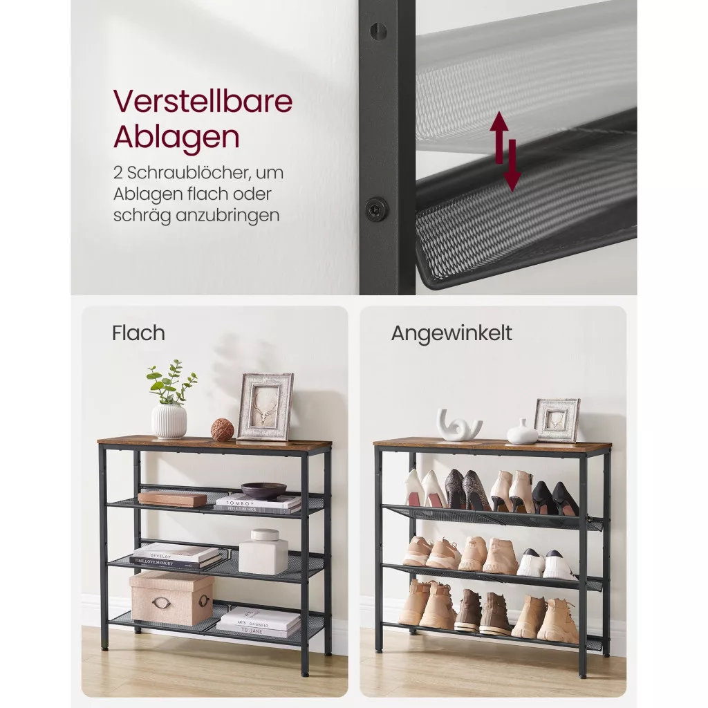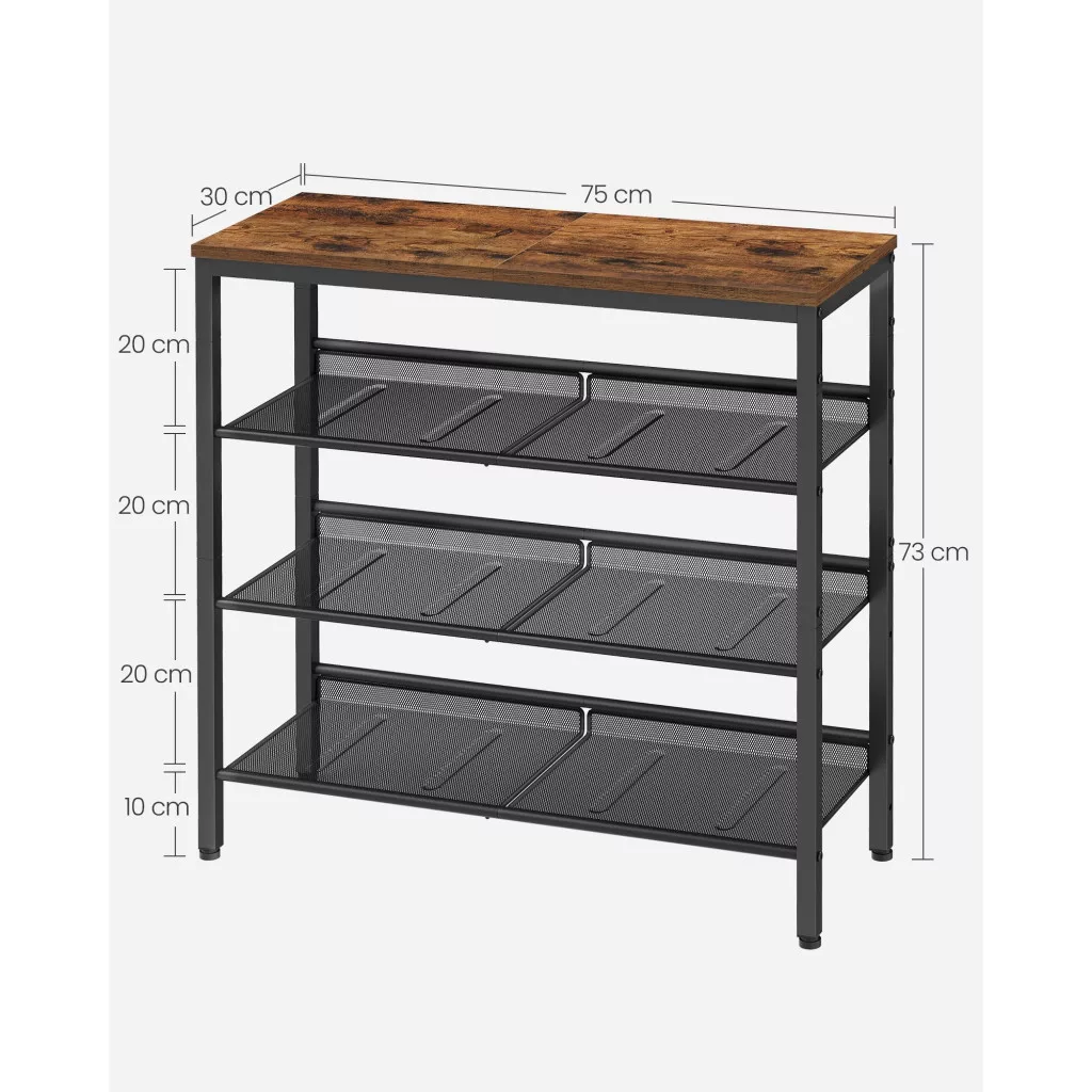 VASAGLE Cipőtároló polc, 4 szintes, állítható hálós polcokkal, rusztikus barna 75x28x72cm