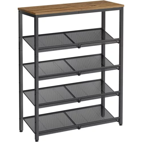 Cipőtároló polc, 5 szintes, állítható hálós polcokkal, mézbarna és fekete 75x28x93cm