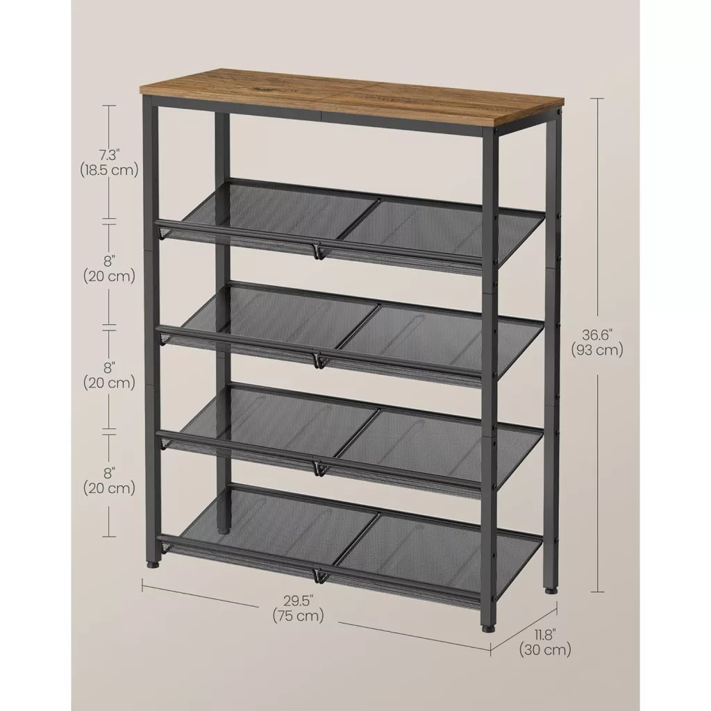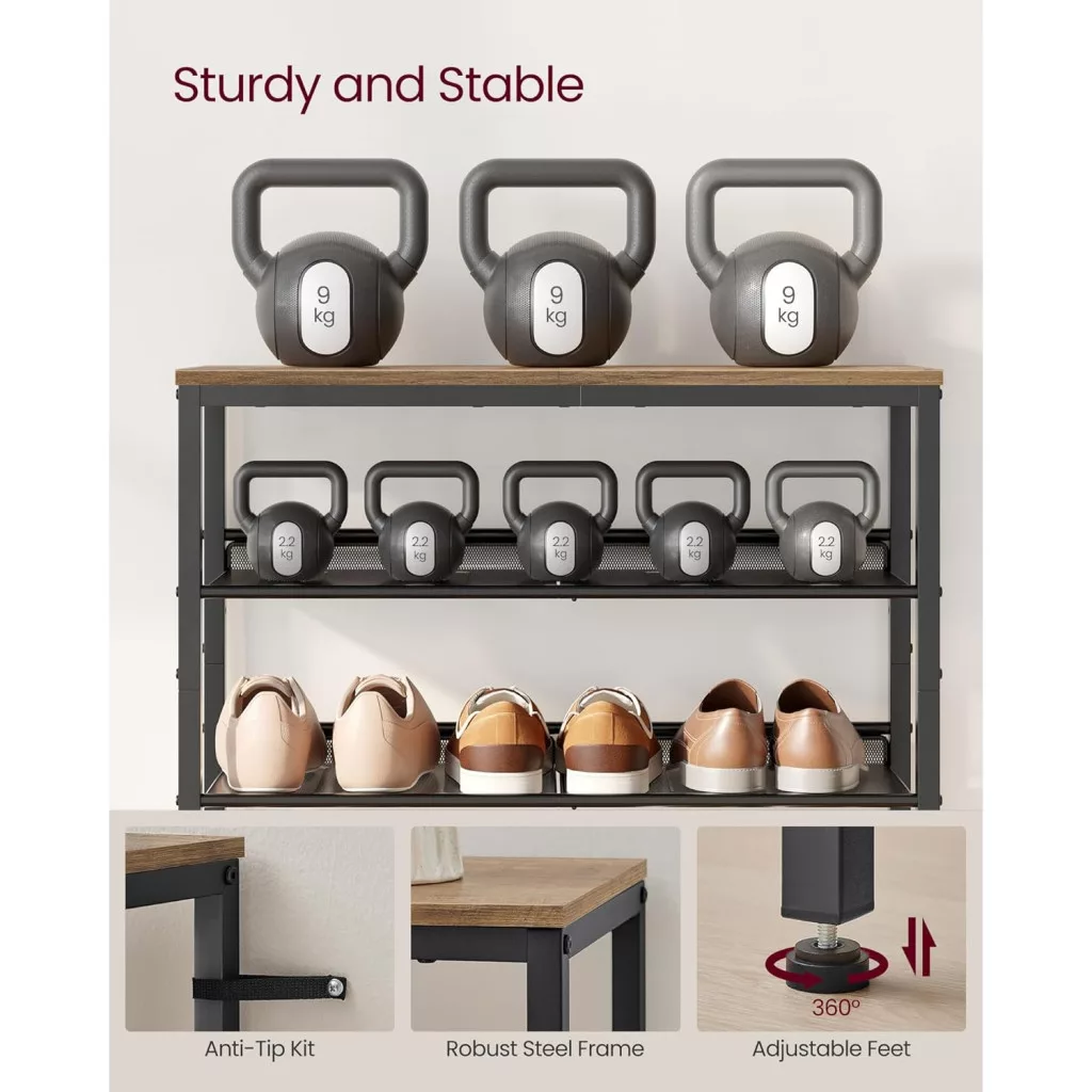 Masszív és Szép: Ez a cipőtartó forgácslapból és acélból készült, ami stabil és masszív szerkezetet biztosít, emellett rusztikus ipari dizájnjával stílusos polc is, amely feldobja az előszobát.