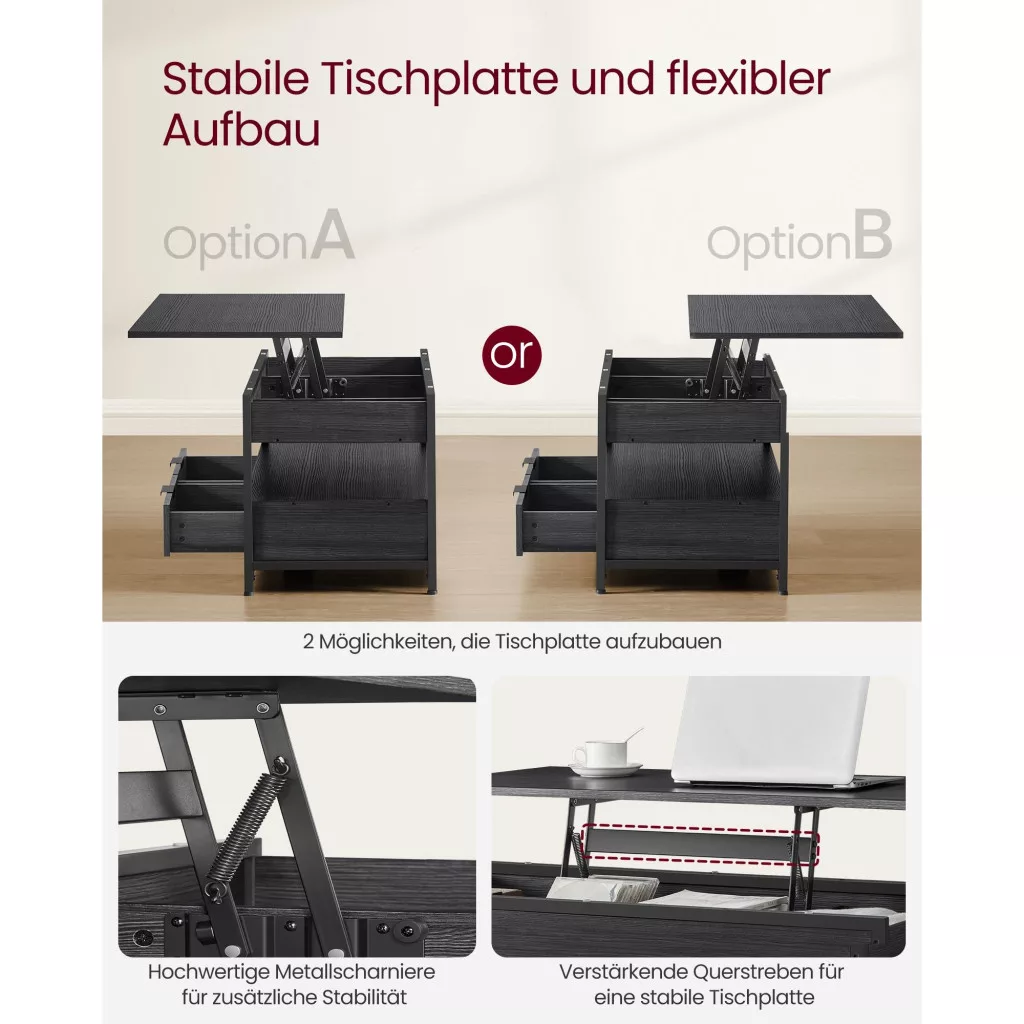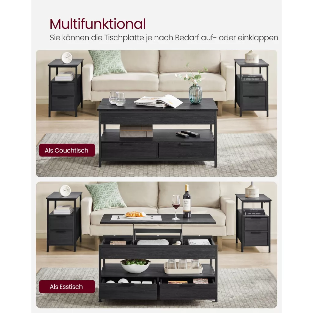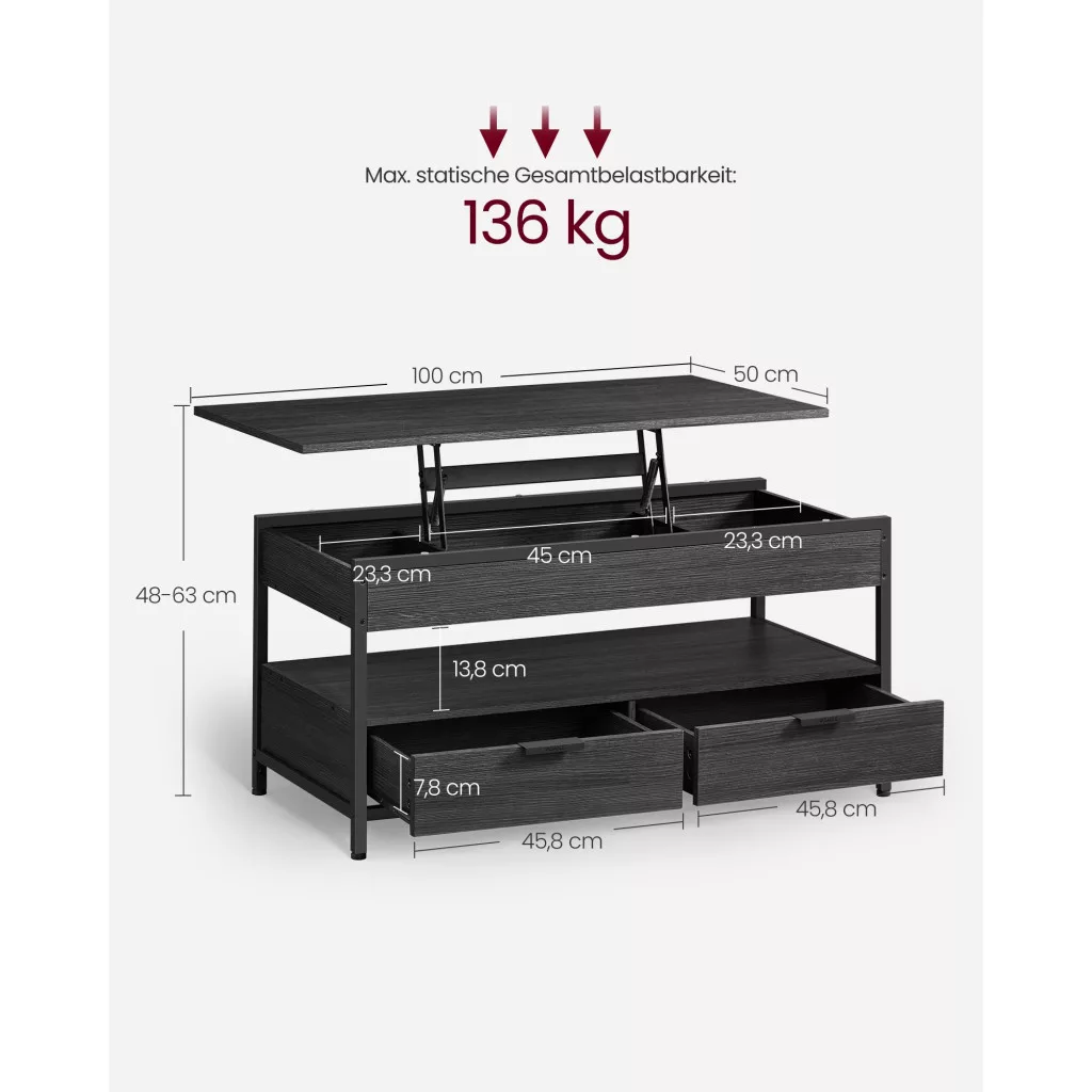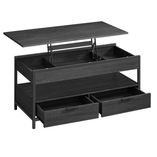 Dohányzóasztal, emelhető asztallappal, rejtett tárolóval, szénszürke és fekete, 100x50x48cm