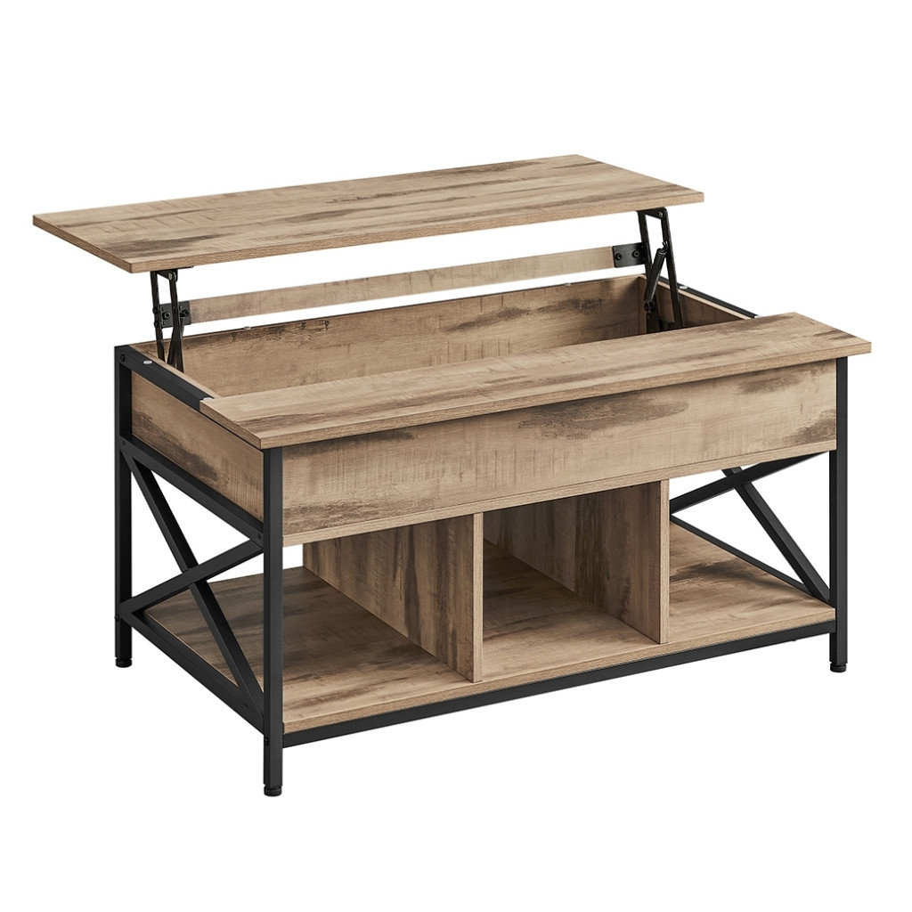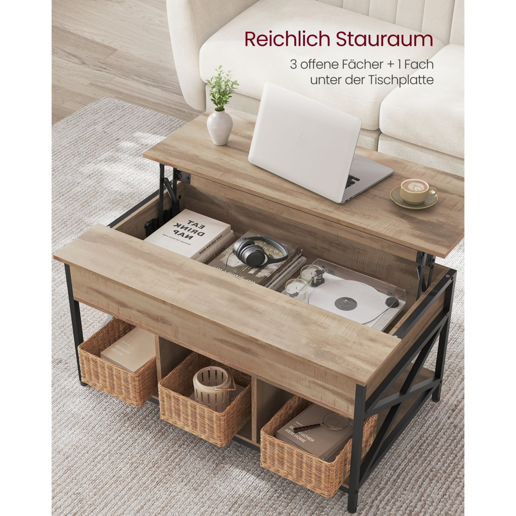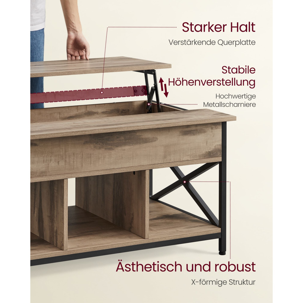 VASAGLE Dohányzóasztal, emelhető asztallappal, rejtett tárolóval, világos barna, 60x100x(48-62) cm
