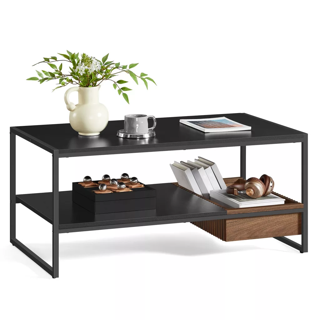 Modern Dizájn:A fekete keret a kolumbiai diófa mintázattal egyszerűvé, de elegánssá teszi ezt a dohányzóasztalt. A fiók rácsos panellel van kialakítva, ami vizuálisan adja meg a végső simítást.