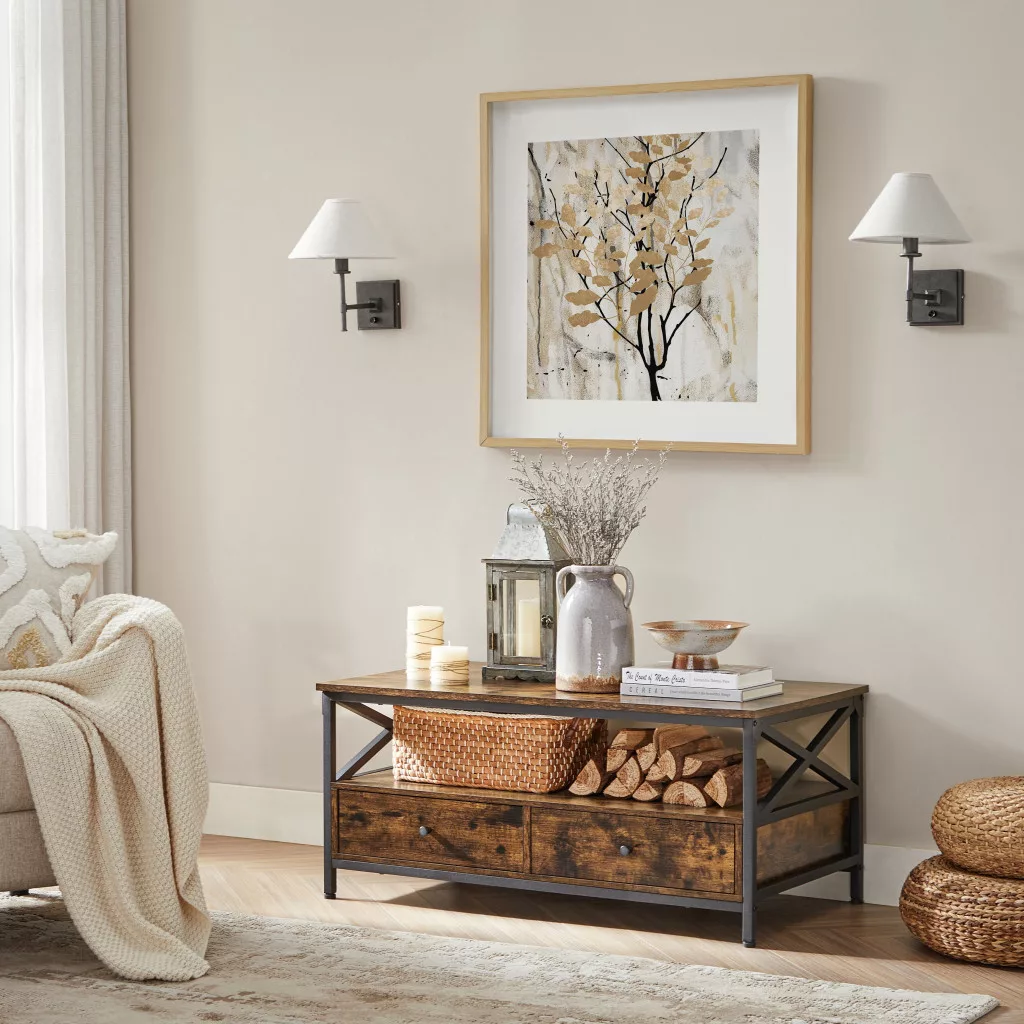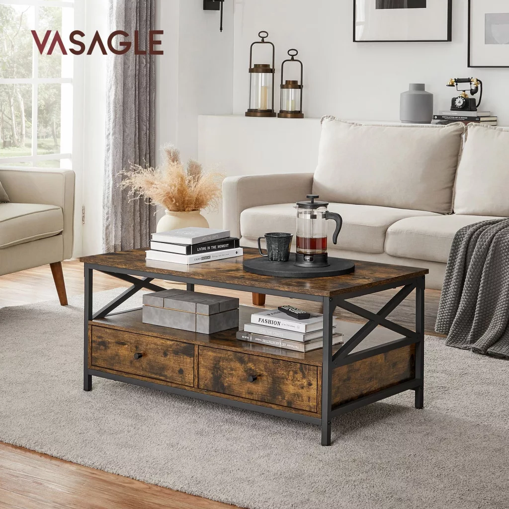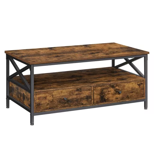 VASAGLE Dohányzóasztal, Nappali Asztal, 2 Fiókkal és Nyitott Tárolópolccal, X Alakú