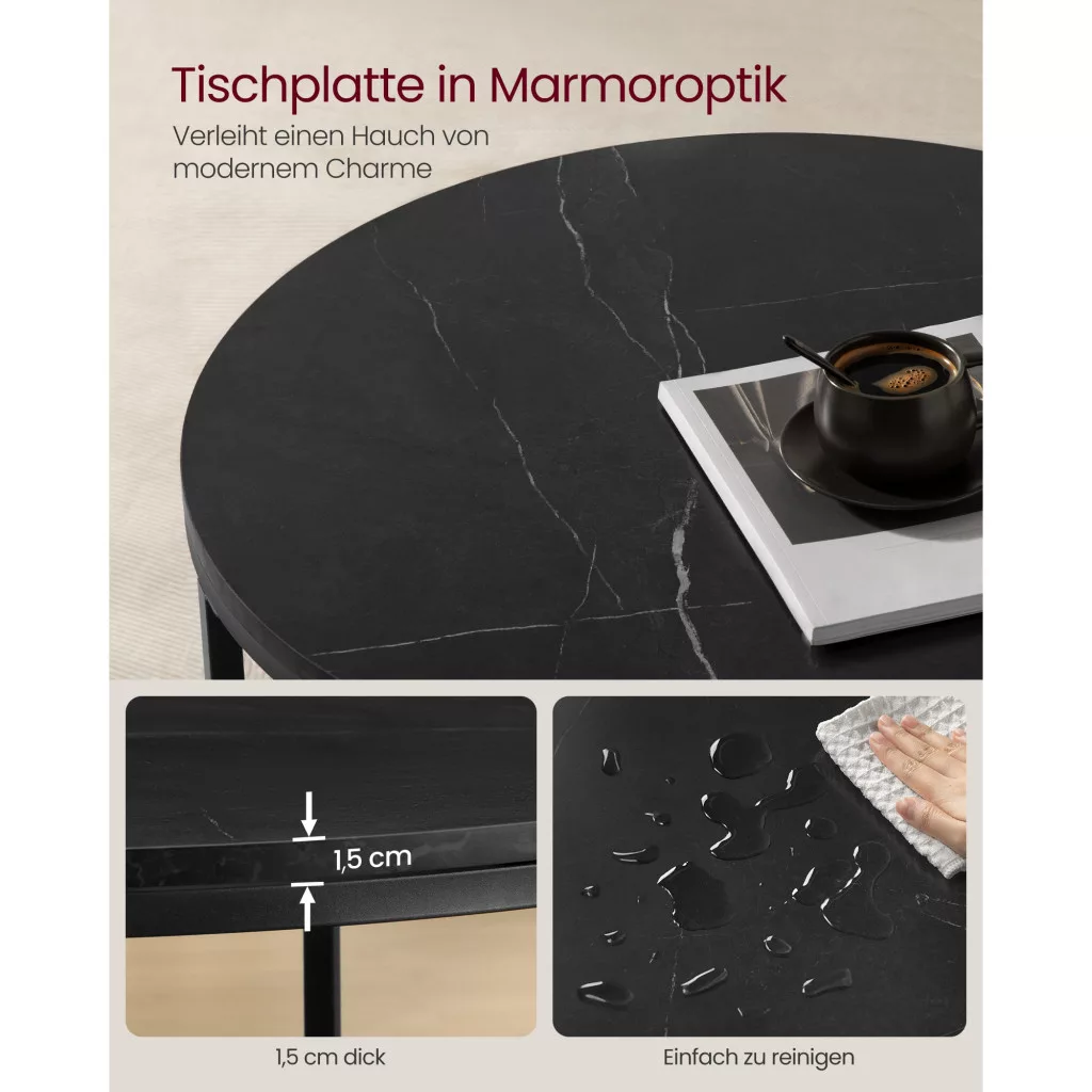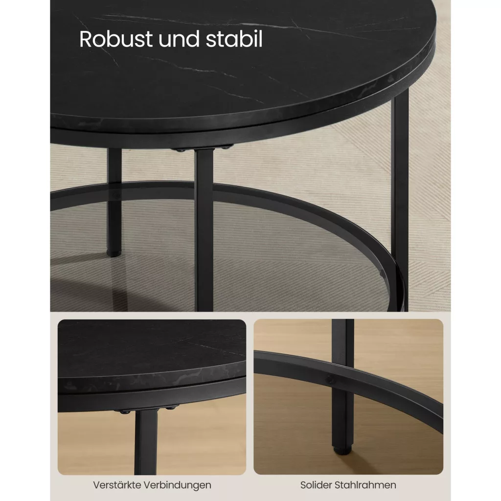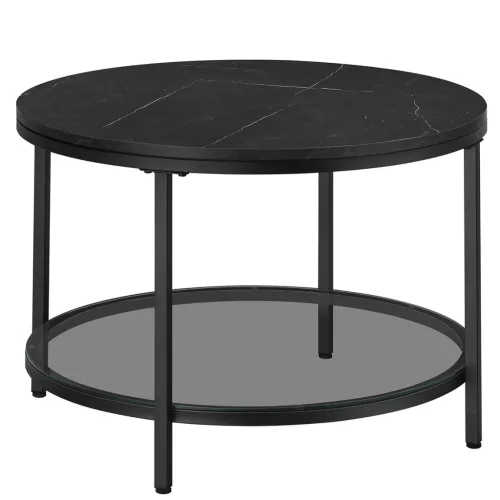 Dohányzóasztal, műmárvány asztallap, edzett üveg polc, márvány fekete, fekete, 65cm