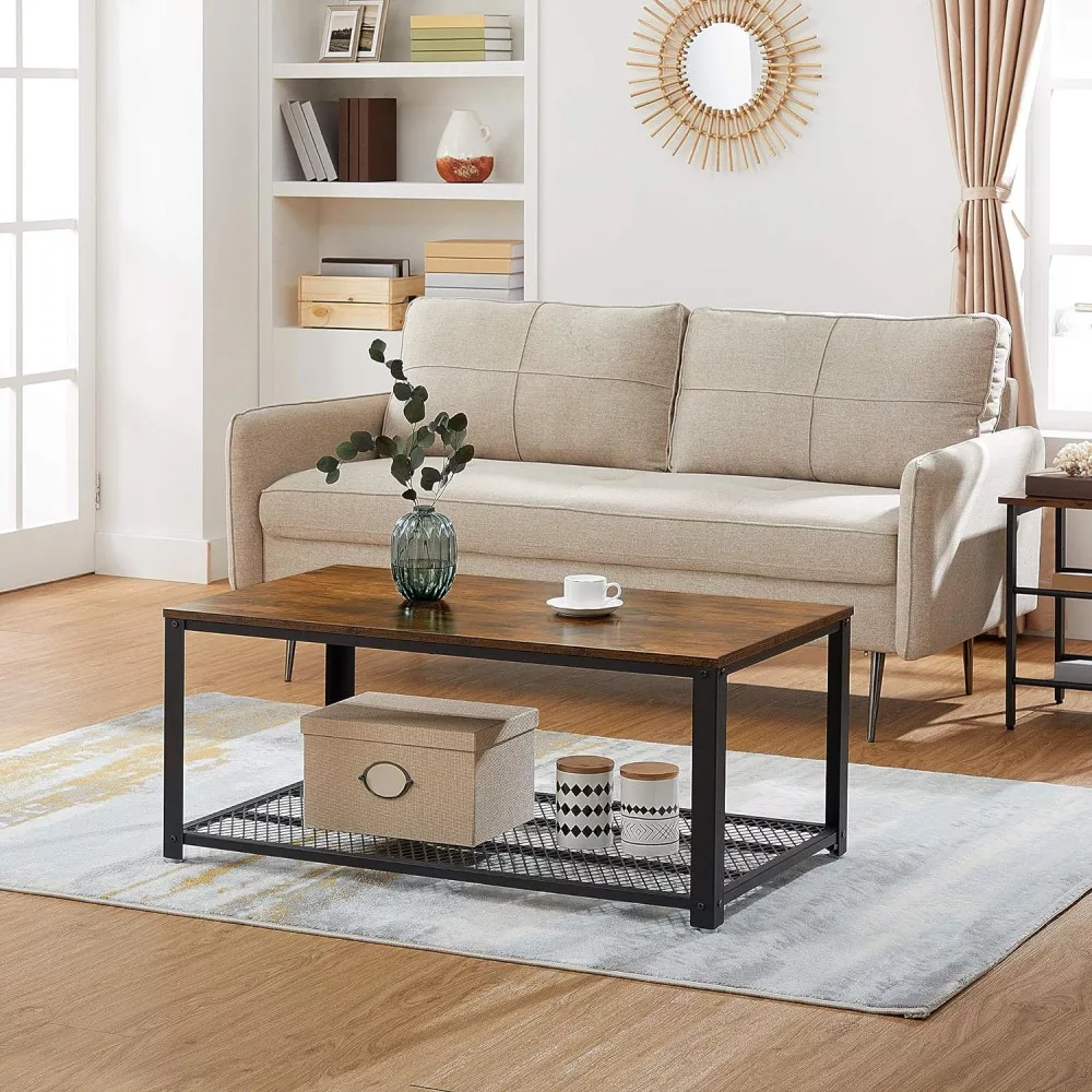 Ipari Dizájn: A rusztikus barna felület, fekete acélkeret és figyelemfelkeltő fémhálós díszítés révén ez az ipari stílusú dohányzóasztal karaktert ad a nappalidnak.