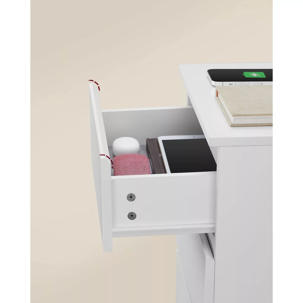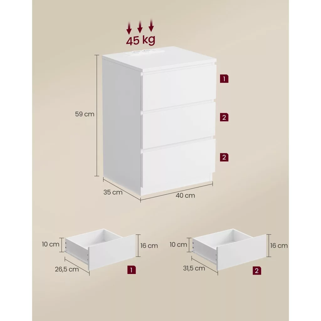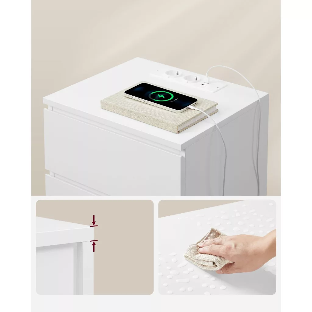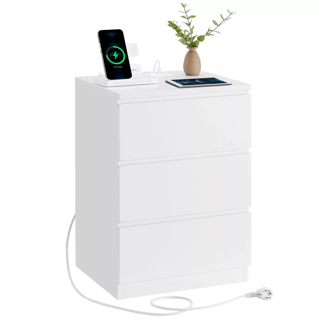 VASAGLE LET631W14 éjjeliszekrény, oldalasztal, 3 fiókkal, ferde éllel, 2 hálózati aljzattal, 2