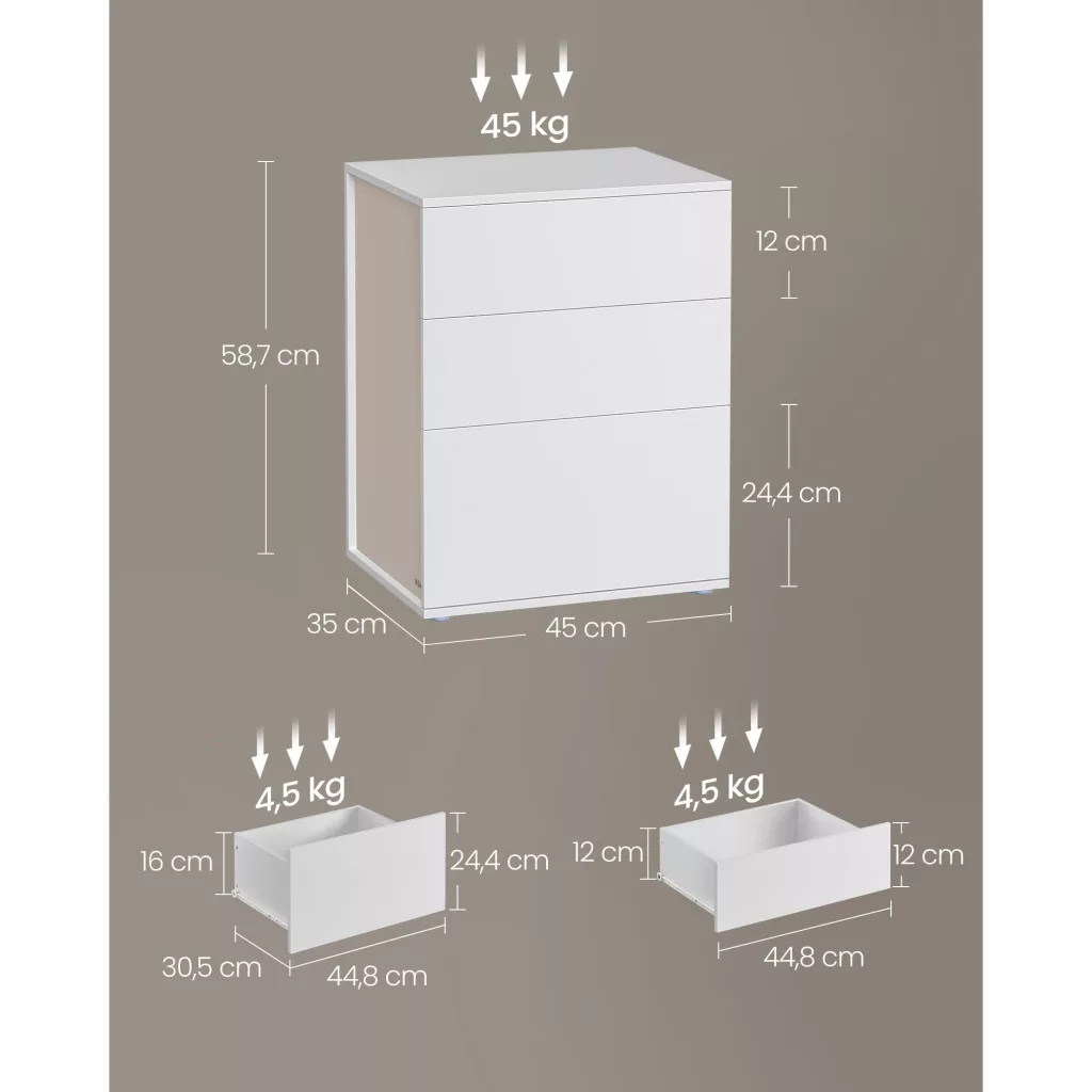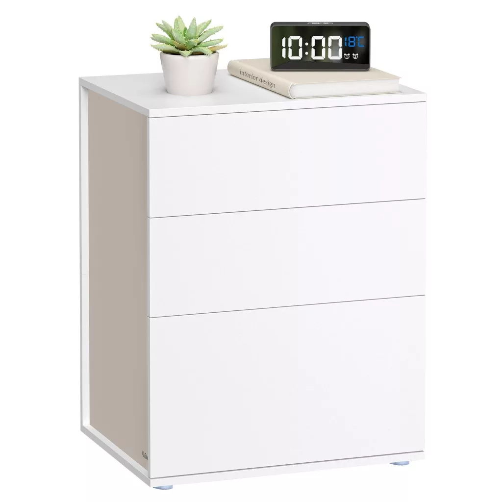 VASAGLE Éjjeliszekrény, 3 fiókkal, fehér és bézs
