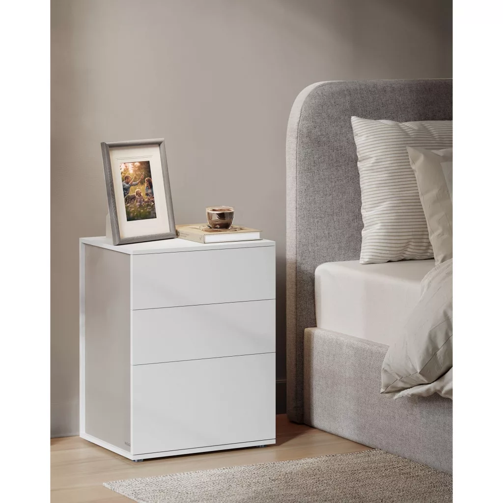 Modern sikk: Emelje hálószobáját egy modern, minimalista éjjeliszekrénnyel. A süllyesztett oldalak és a matt fehér, valamint cappuccino bézs kétszínű kialakítás letisztult, modern hangulatot áraszt, tökéletes a nyugodt, pihentető légkör megteremtéséhez