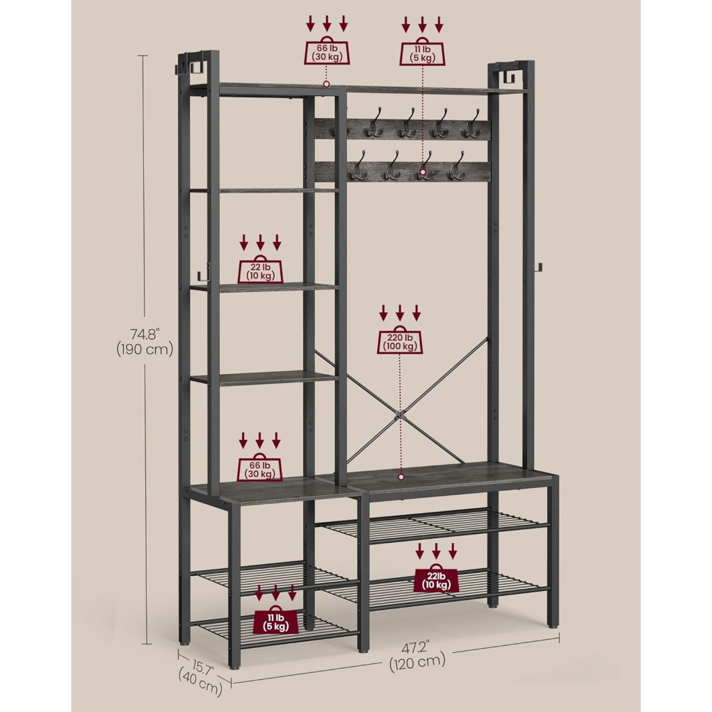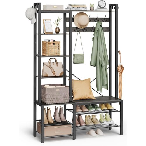 VASAGLE Előszoba fogas és ruhatároló, akasztókkal, polcokkal, kőszürke és fekete 120x40x190cm