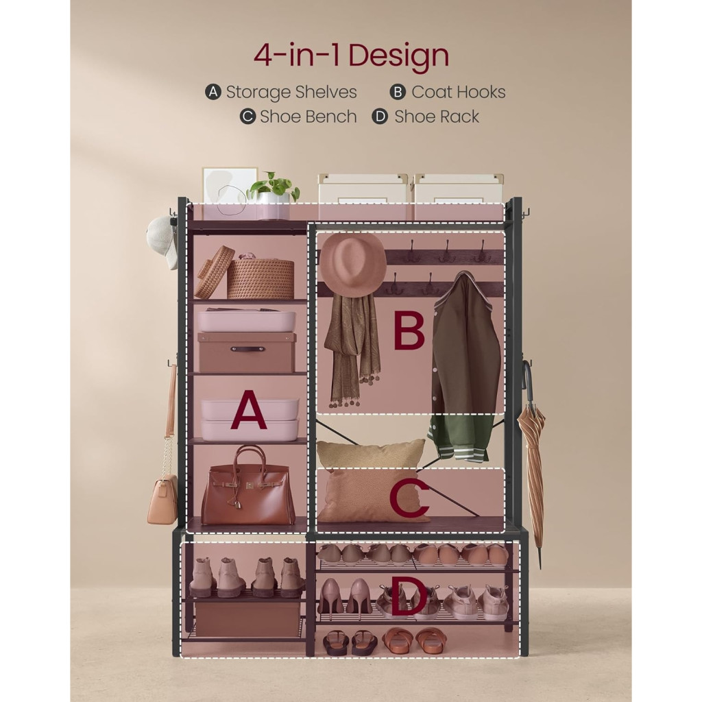 4 az 1-ben kialakítás: Ez a előszobafal kabáttartó kampókat, egy padot, egy cipőtartót és tárolópolcokat kombinál, hogy optimalizálja a teret és segítse egy rendezett és funkcionális előszoba kialakítását.