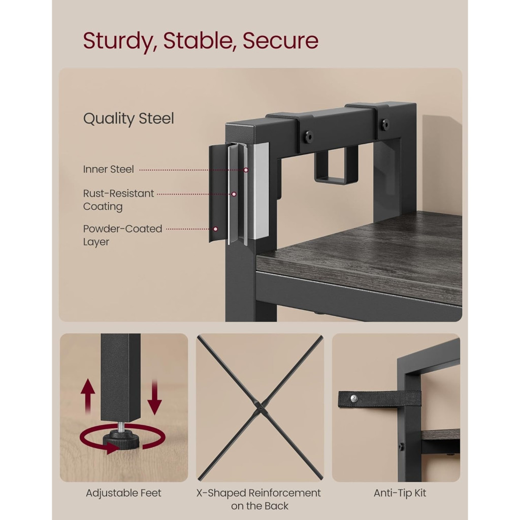 Masszív és stabil: A kiváló minőségű forgácslap és a masszív acélszerkezet tartós előszobafalat hoz létre. A jobb oldali pad akár 100 kg-ot is elbír. Az állítható lábak és a dőlésgátló készlet fokozott stabilitást és biztonságot nyújtanak.