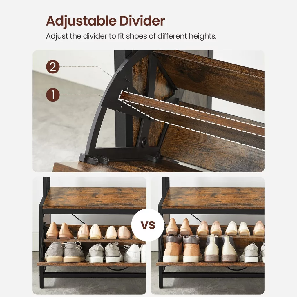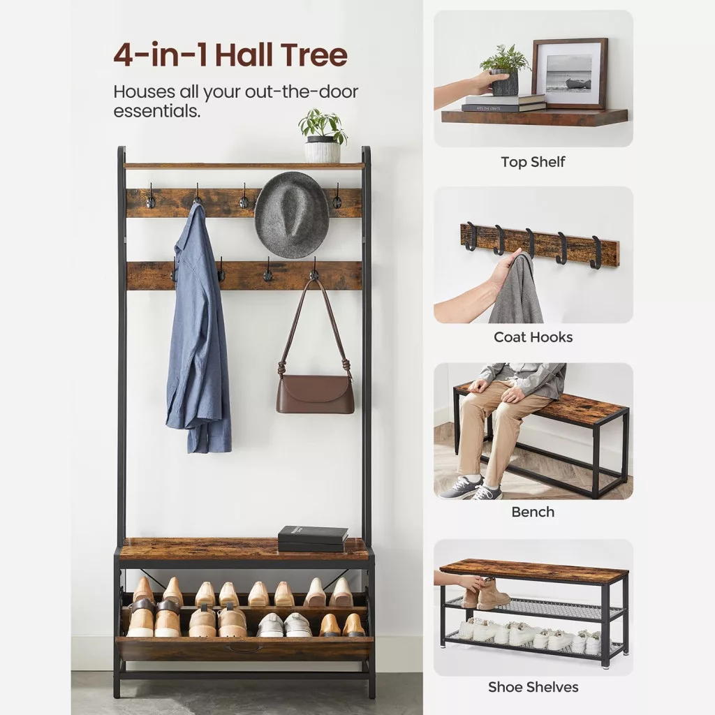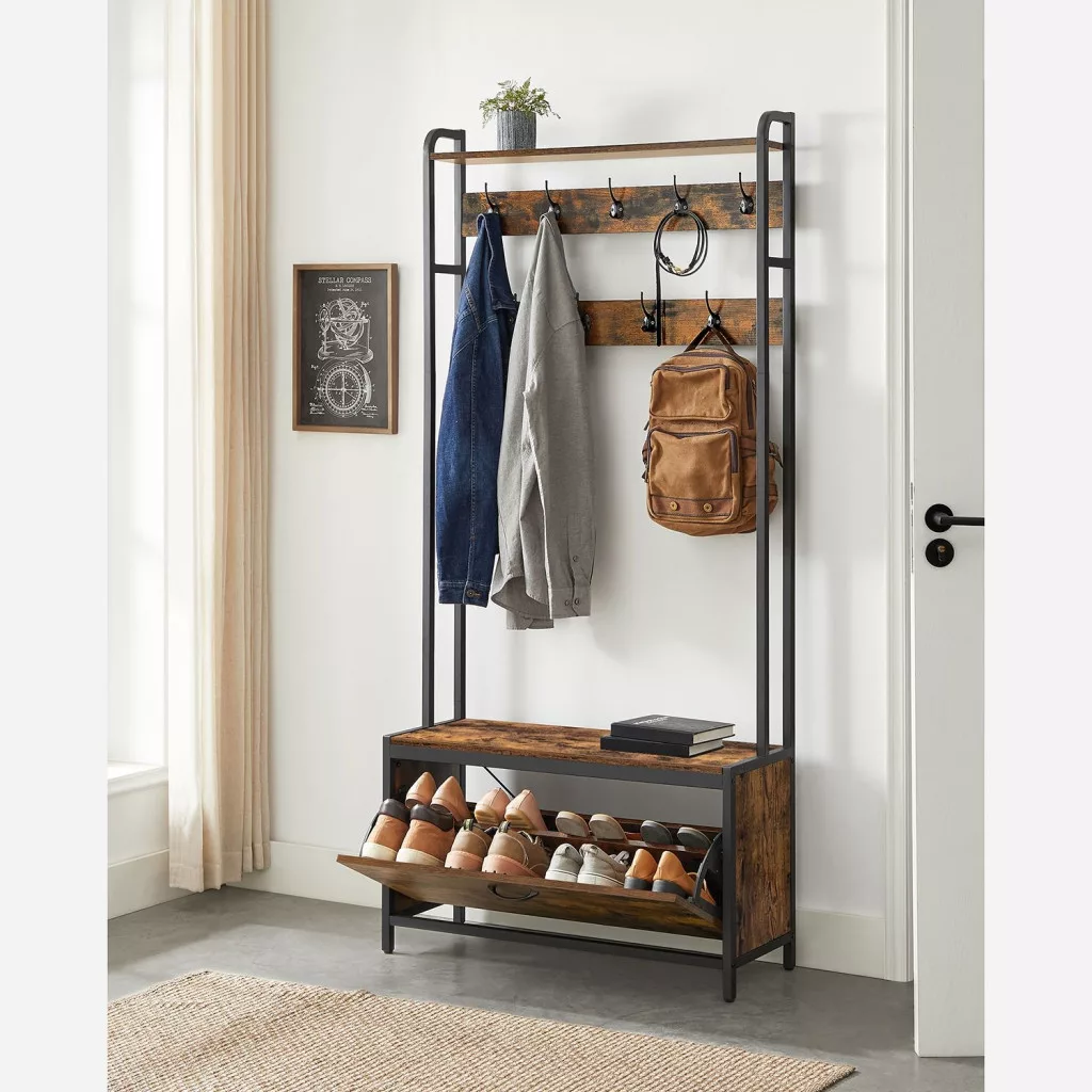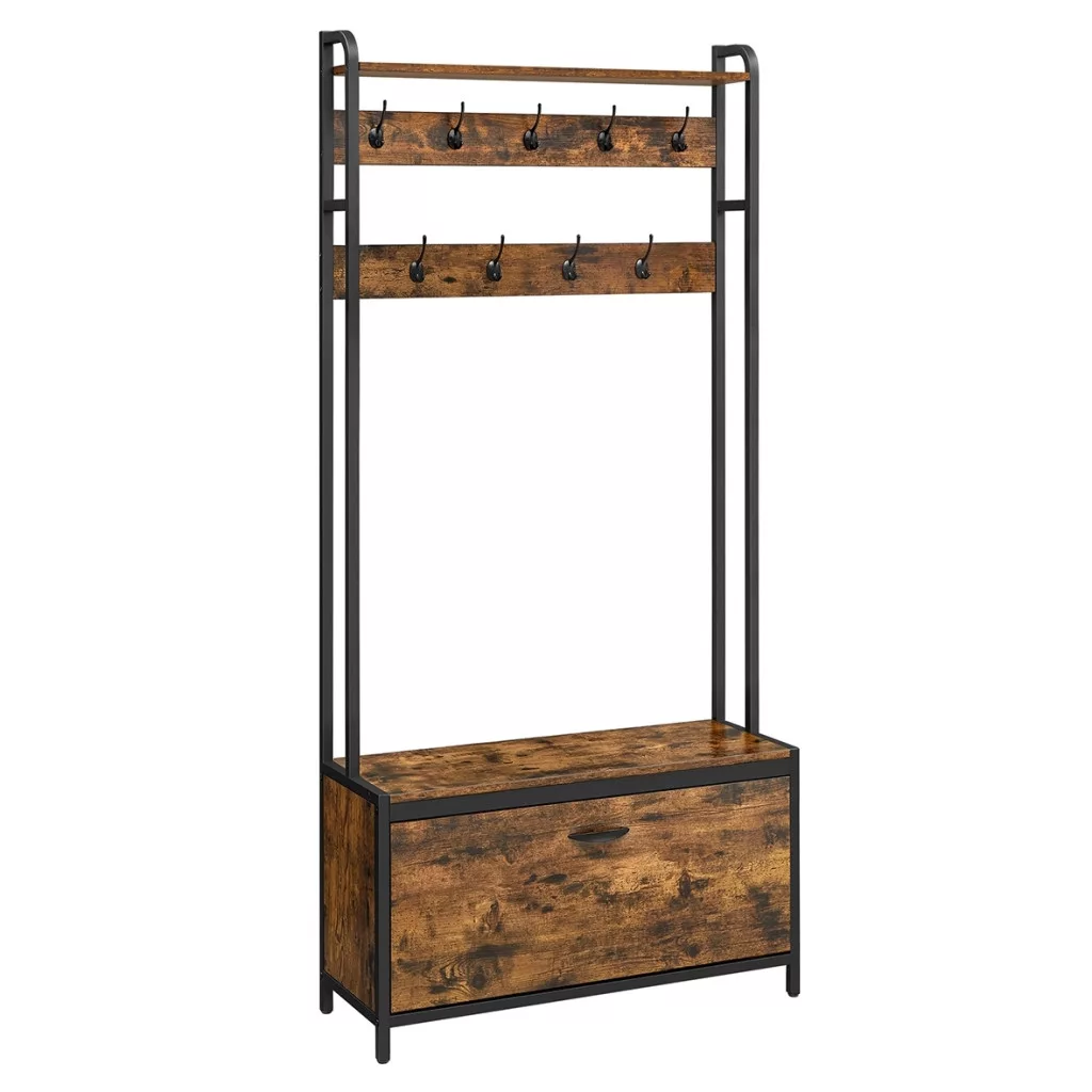 VASAGLE Előszoba fogas paddal, akasztókkal, cipőszekrény, rusztikus barna 85x30x180cm
