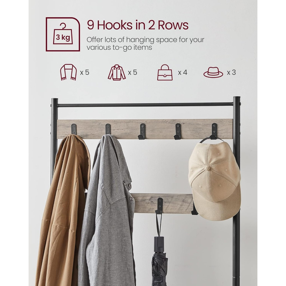 9 Masszív Akasztó: 9 rozsdamentes fém akasztó 2 sorban, mindegyik akár 3 kg-ot is elbír, masszív és tartós, rengeteg akasztási helyet kínál kabátok, táskák, kalapok, sálak és egyéb útközbeni tárgyak számára—tökéletes hosszú távú használatra