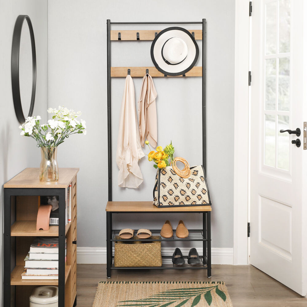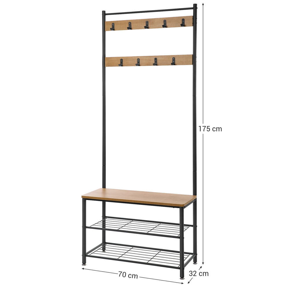 VASAGLE Előszoba fogas polccal, akasztókkal, cipőtartóval és ülőkével, mangó 175x70x32cm