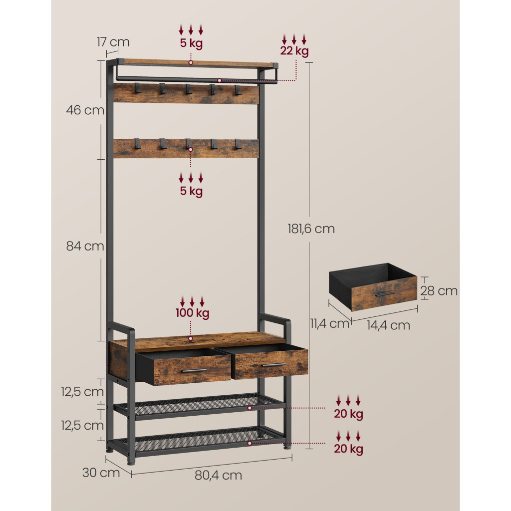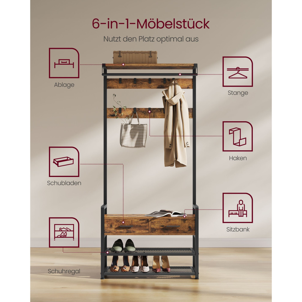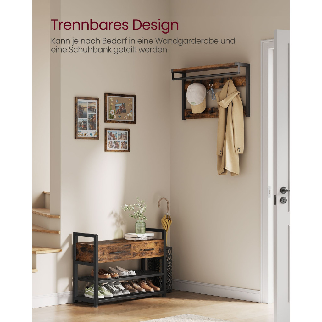 VASAGLE VASAGLE előszobafal paddal és cipőtárolóval, előszobai kabáttartó cipőpaddal, 2 textilfiókkal, 10 akasztóval, 11,8 x 31,7 x 71,5 hüvelyk, vintage barna és tinta fekete HSR429B01