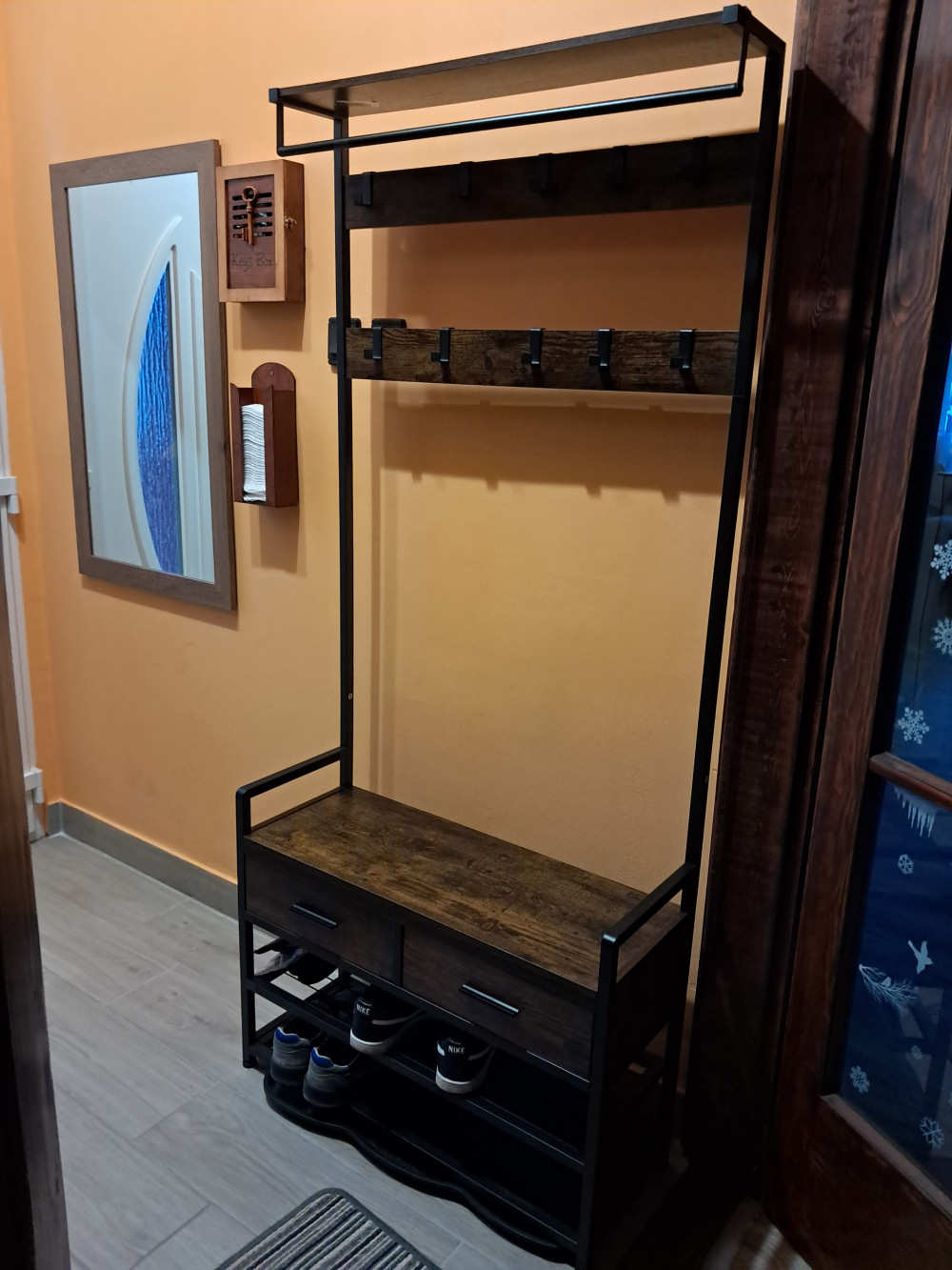 Multifunkcionális 6 az 1-ben kialakítás: Ez a előszobafal 10 kabátakasztót, 2 fiókot, egy ruhatartó rudat, egy padot, egy cipőtartót és tárolópolcokat kombinál, hogy optimalizálja a teret és segítse egy rendezett és funkcionális előszoba kialakítását