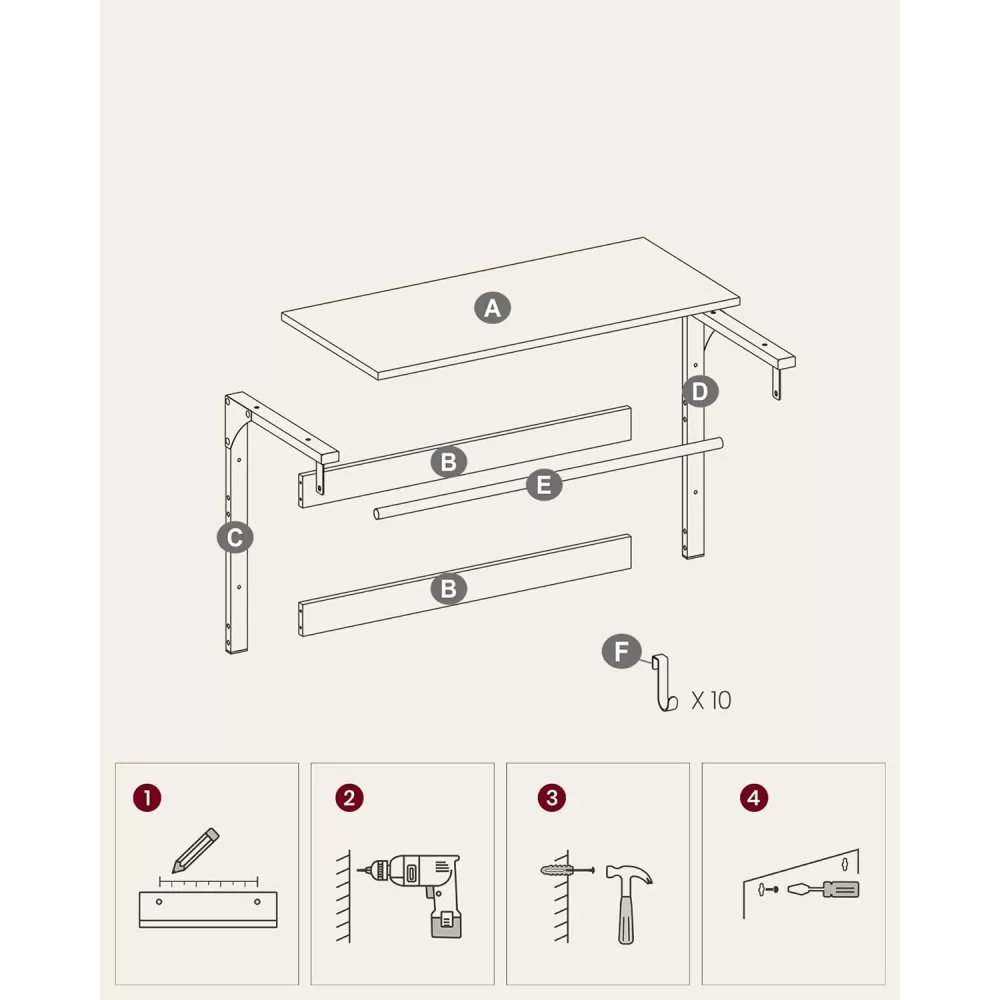 Könnyű összeszerelés: ne féljen az összeszereléstől. Számozott alkatrészekkel és egyértelmű utasításokkal könnyedén összeszerelheti ezt a fali polcot.