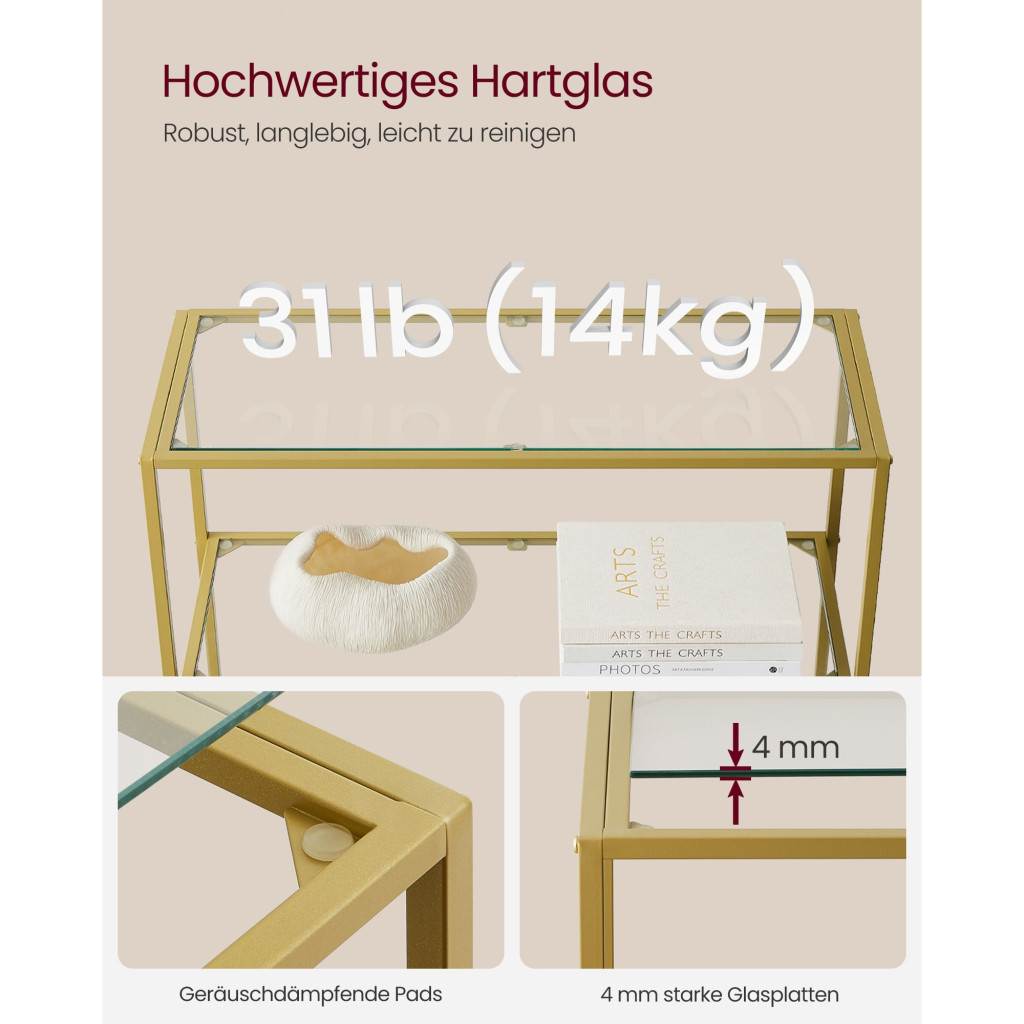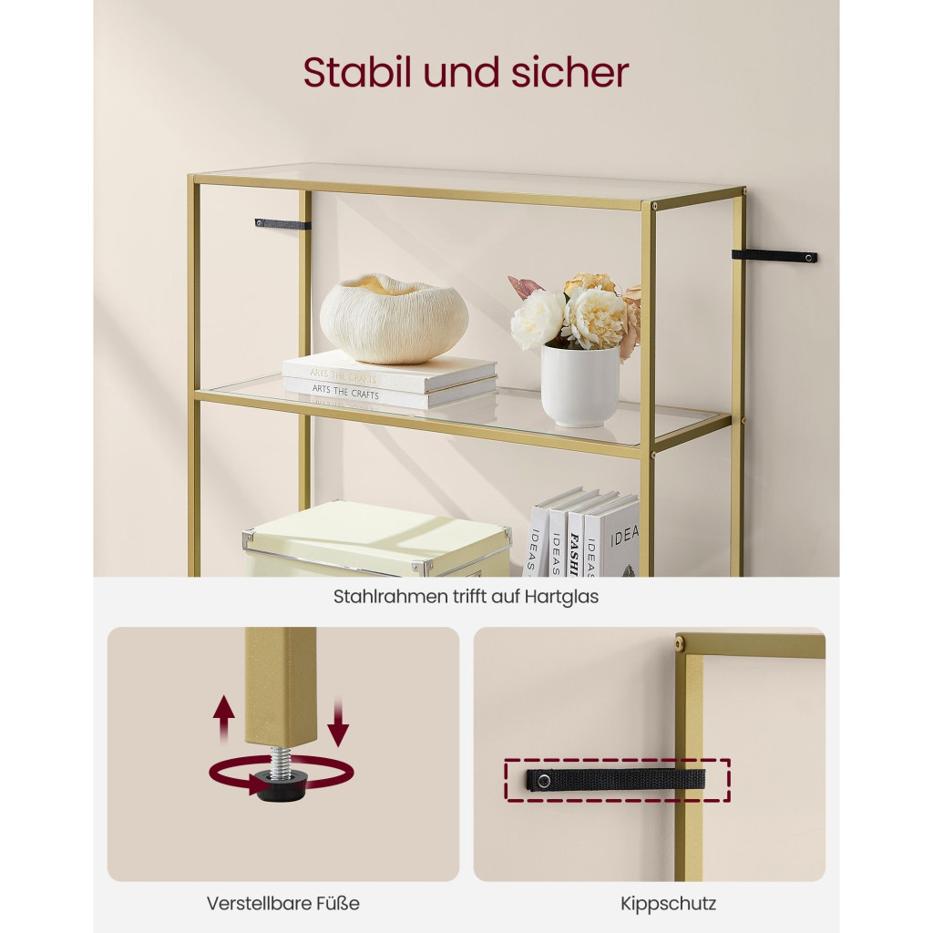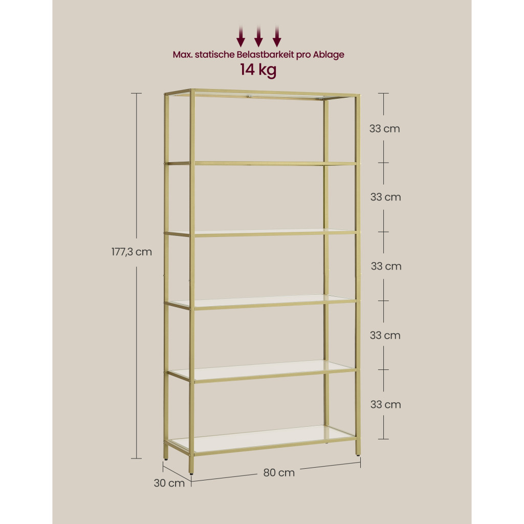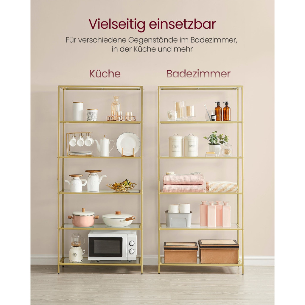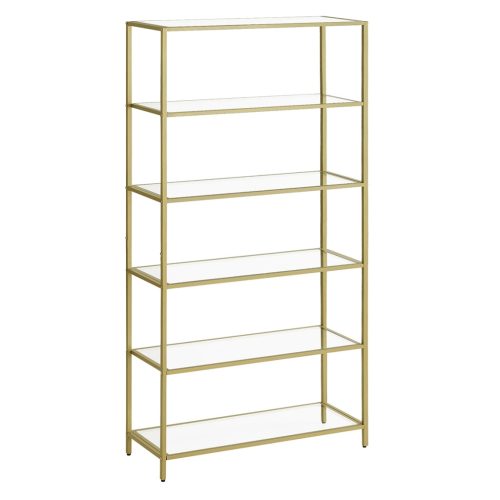 VASAGLE Fém tároló állvány üvegpolcokkal, 6 szintes, arany 80x30x176cm