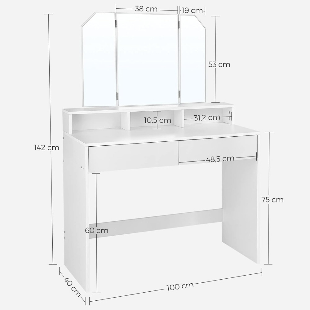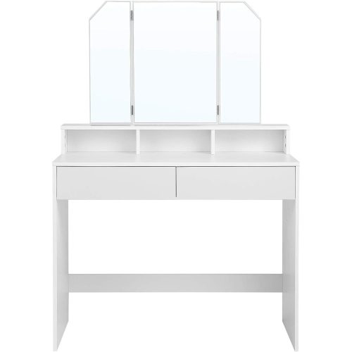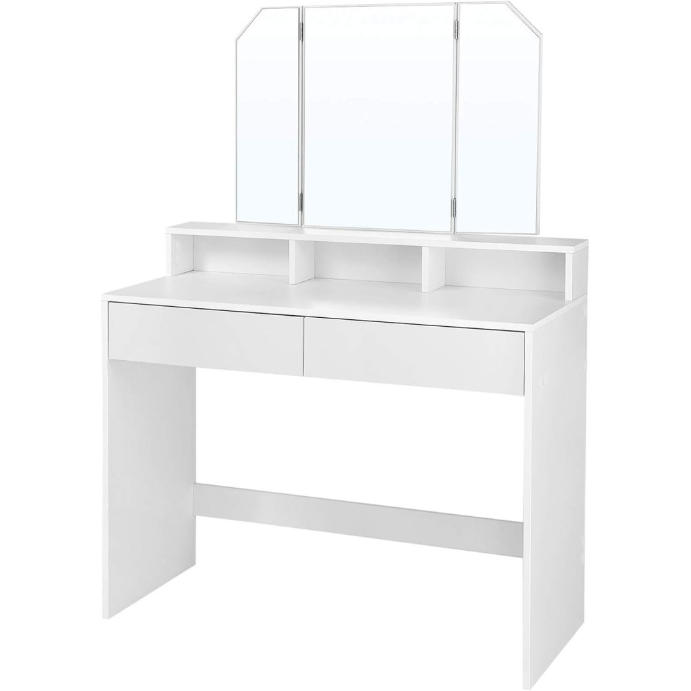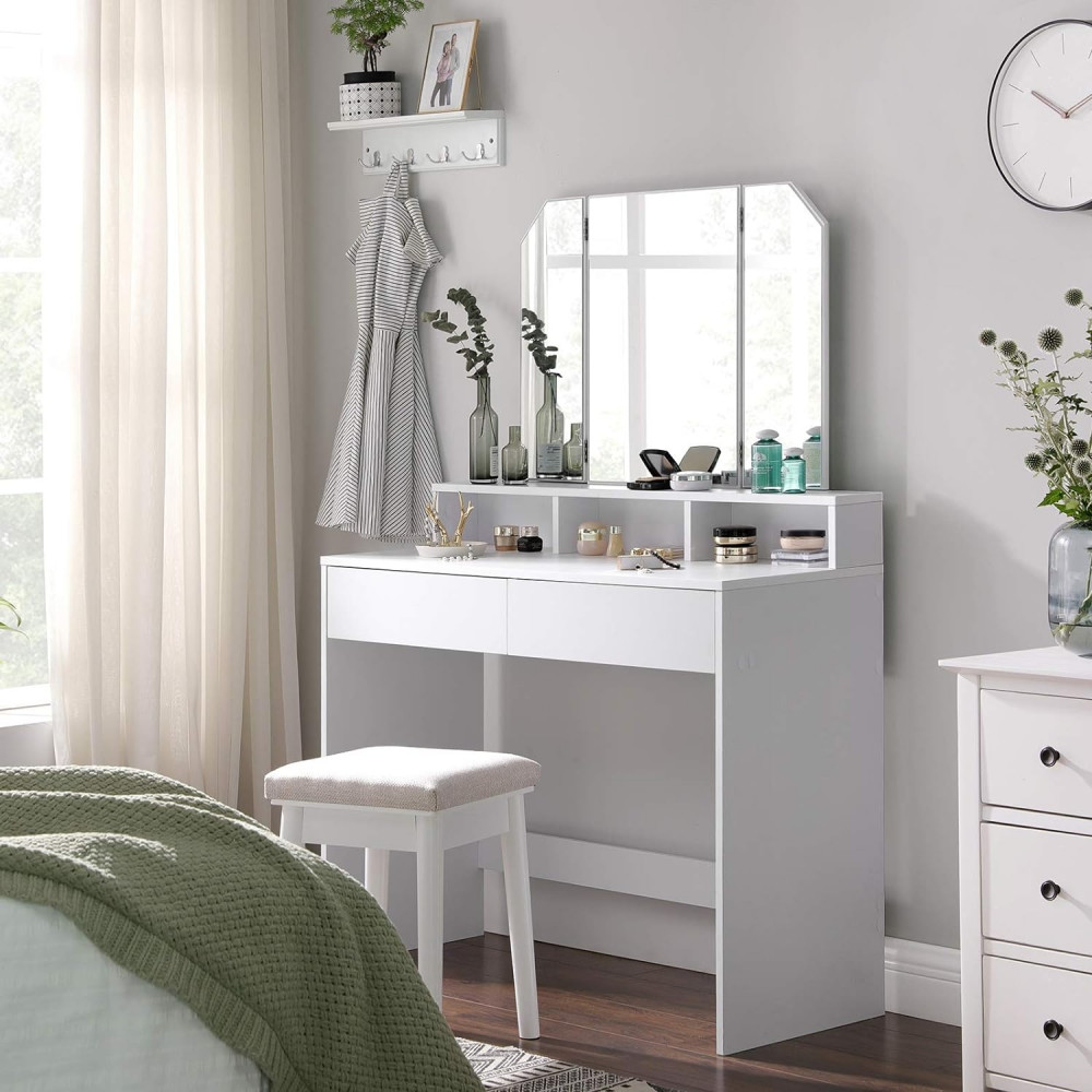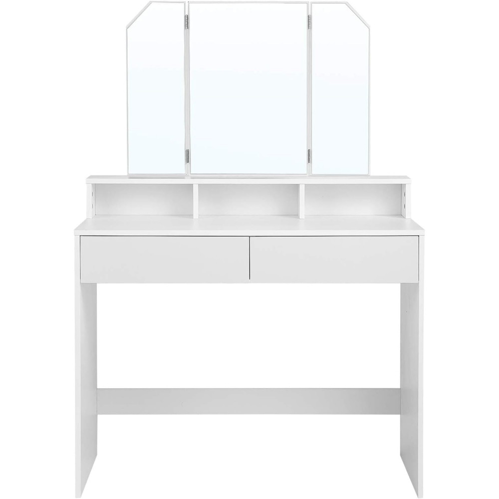 VASAGLE Sminkasztal Tri-fold tükörrel, 2 fiókkal és 3 nyitott rekeszzel, modern stílusú fehér