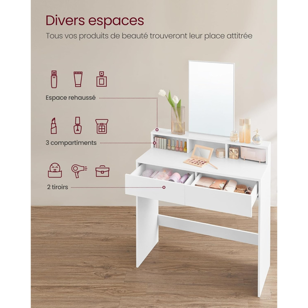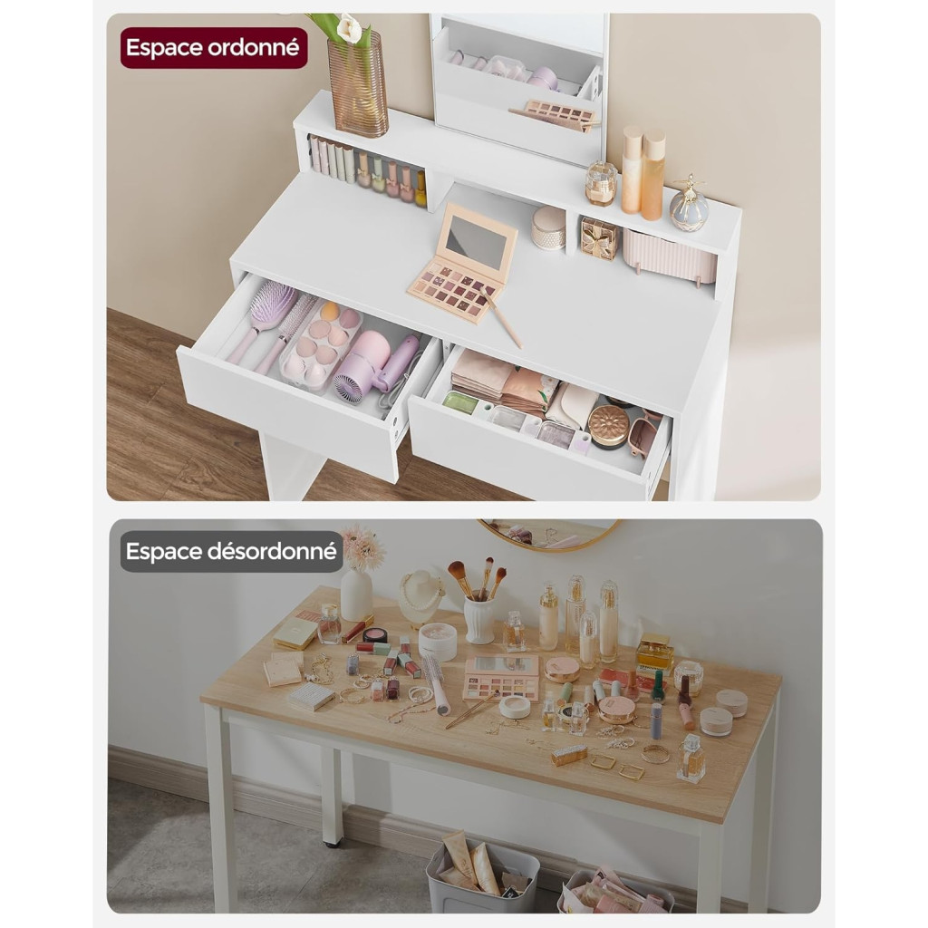 Viszlát foltok! Szemhéjfesték porok, kiömlött alapozó... könnyű összekoszolni magad sminkelés közben. De ne aggódj! Ez a sminkasztal könnyen tisztítható melamin panelekből készült, így mindig ragyogó szépségteret biztosít.