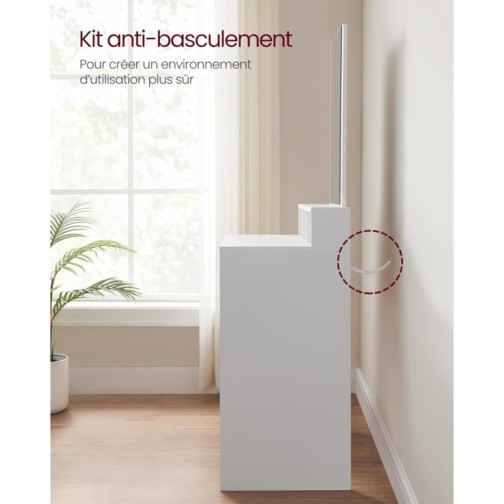 Mit kapsz: Egy fésülködőasztalt 2 fiókkal, 3 nyitott rekesszel és egy nagy tükörrel, ahol minden nap megcsodálhatod magad. Rögzítsd a falhoz a mellékelt dőlésgátló tartozékkal, és kezdj egy új és elegáns szépségápolási rutint.