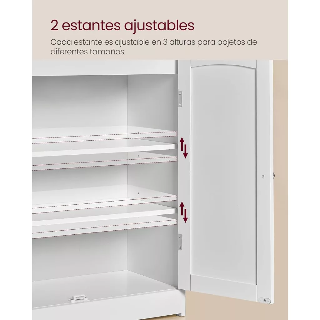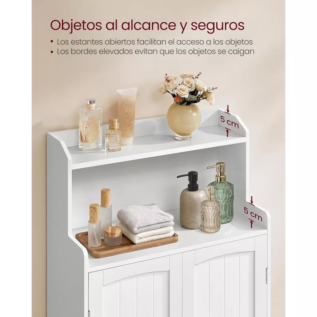 【ÁLLÍTHATÓ POLCOK】Az ajtók mögött 2 polc található, amelyek 3 különböző magasságban állíthatók, hogy különböző méretű tárgyaknak is helyet biztosítsanak. Magas samponos flakonok, összehajtott törölközők vagy kis tárolók, minden elfér ebben a fürdőszobai szekrényben!