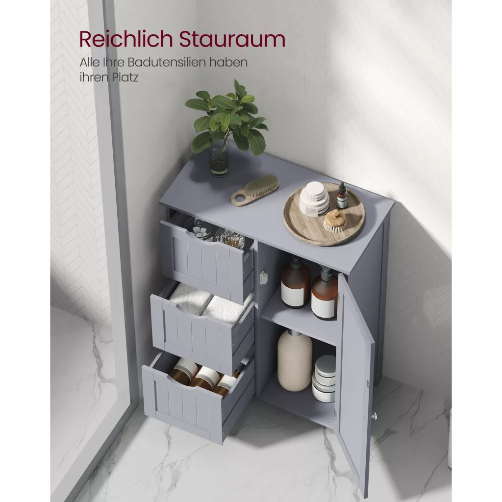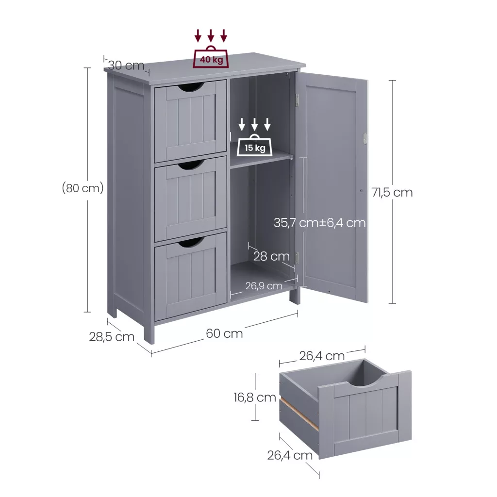 Fürdőszoba szekrény, ajtós, 3 fiókos szekrény, szürke 60x30x81cm