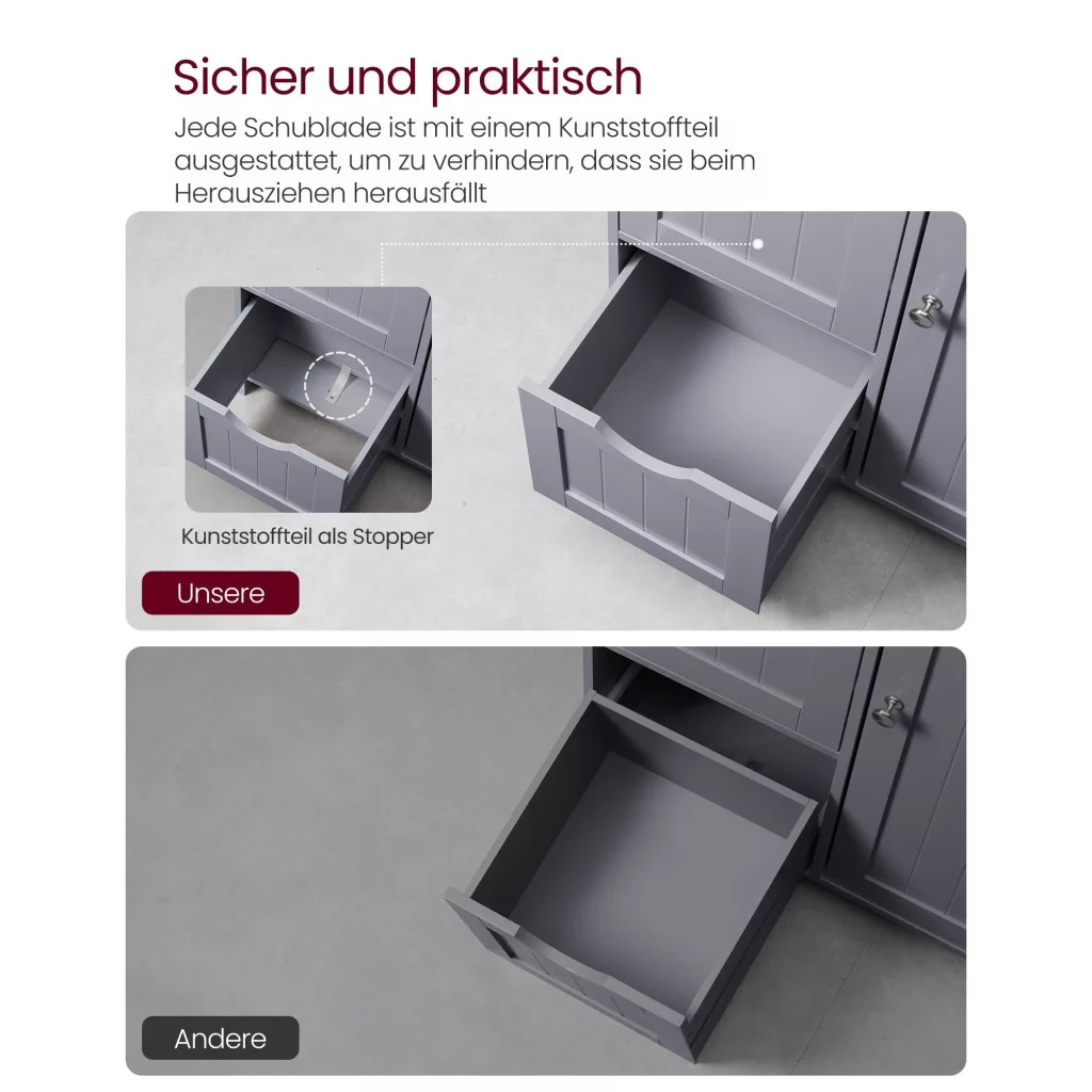 Masszív, stabil és biztonságos: Robusztus MDF-ből készült, ez a fürdőszobai tárolószekrény masszív és stabil; a tárolószekrény hátulján rejtett dőlésgátló készlet növeli az általános stabilitást és biztonságot.