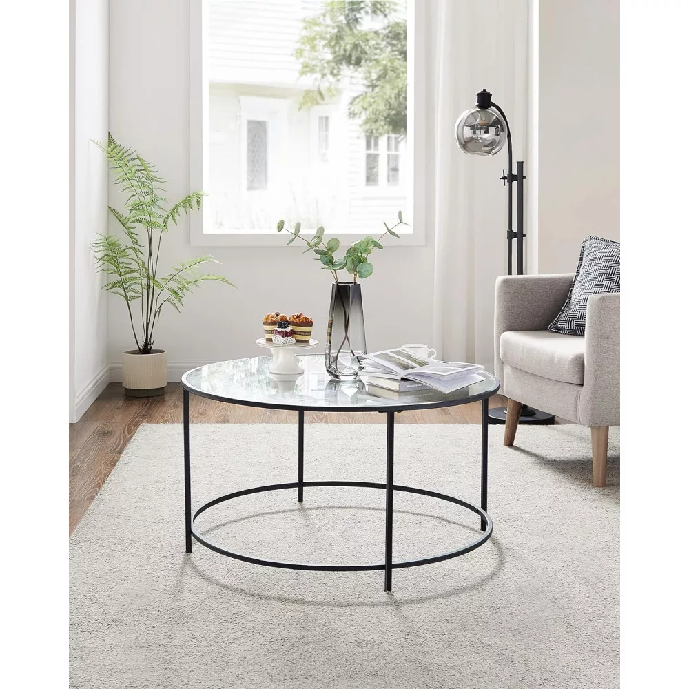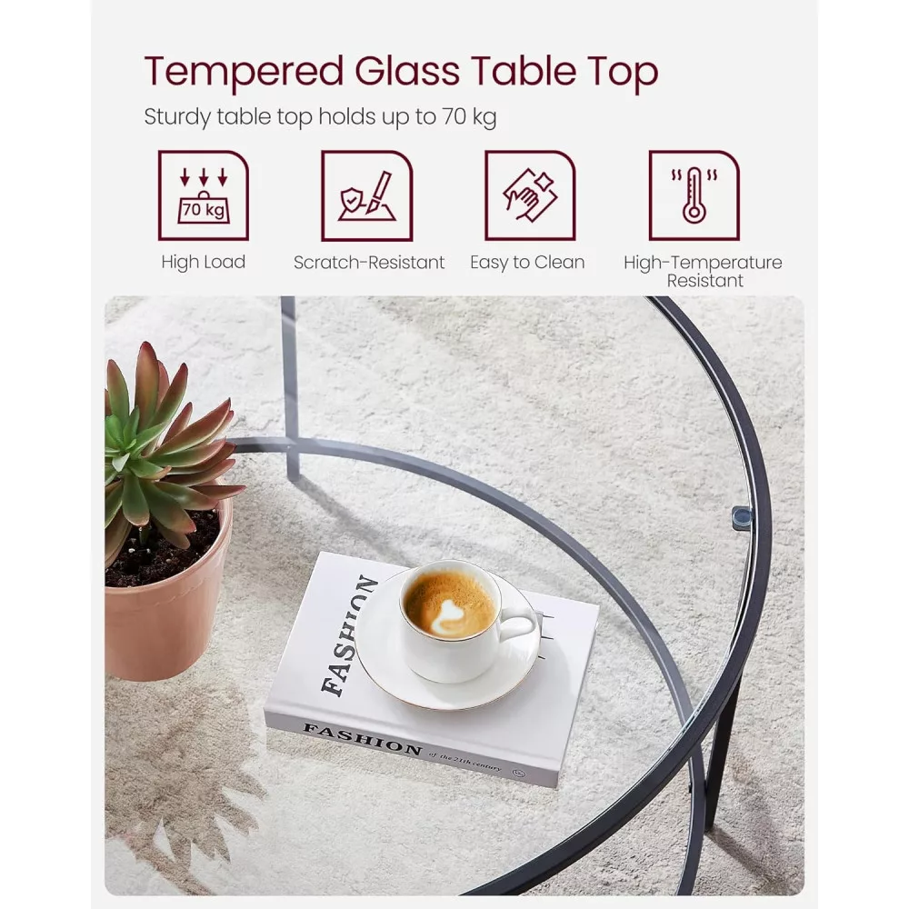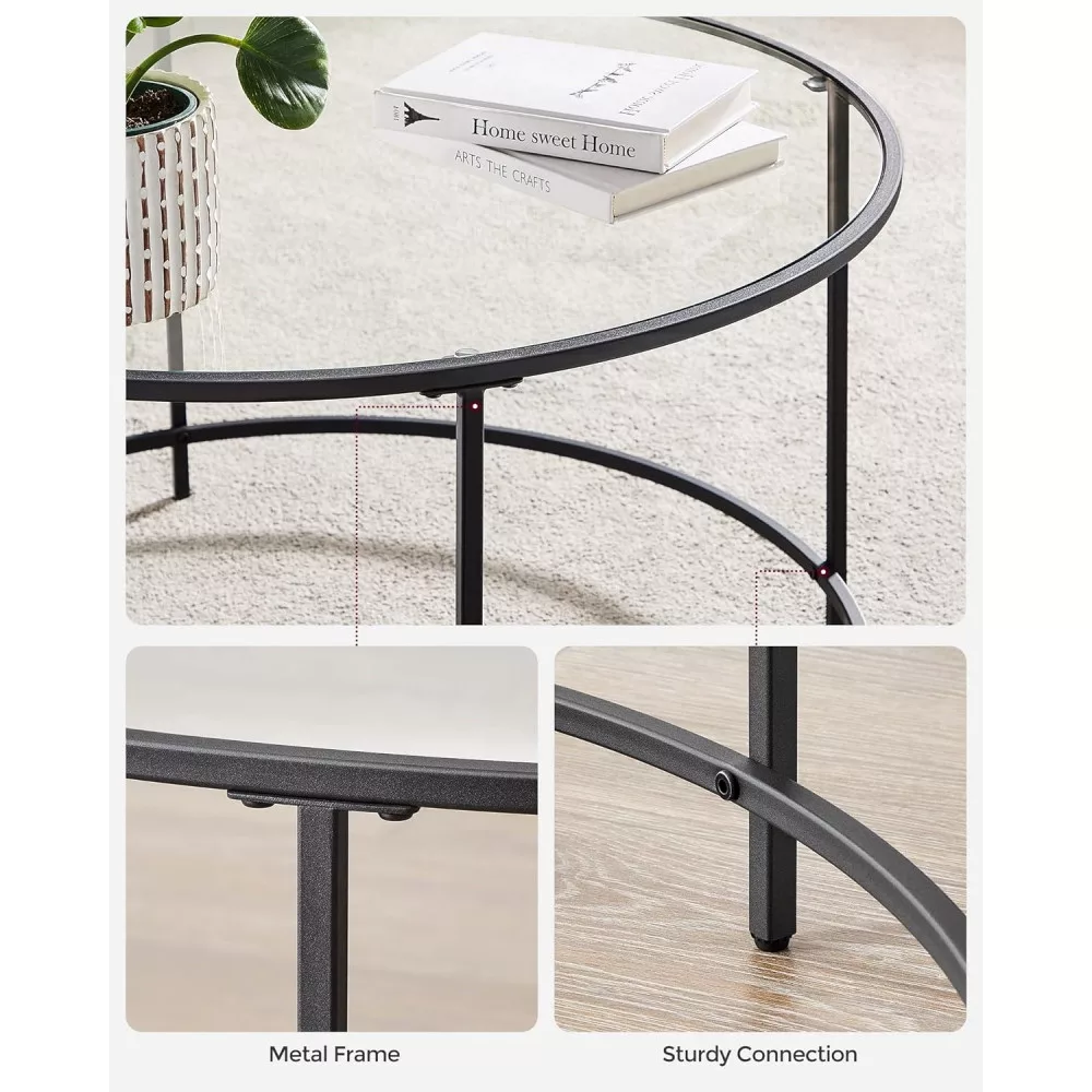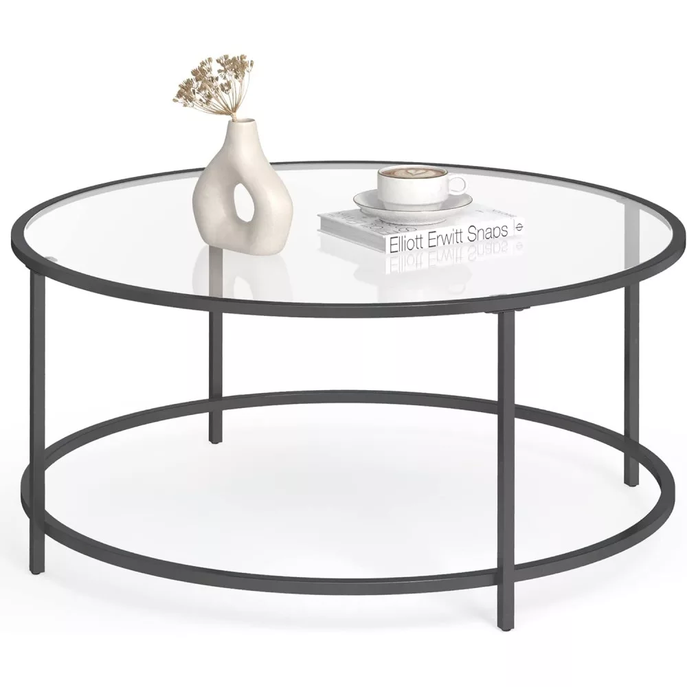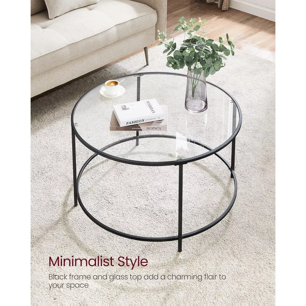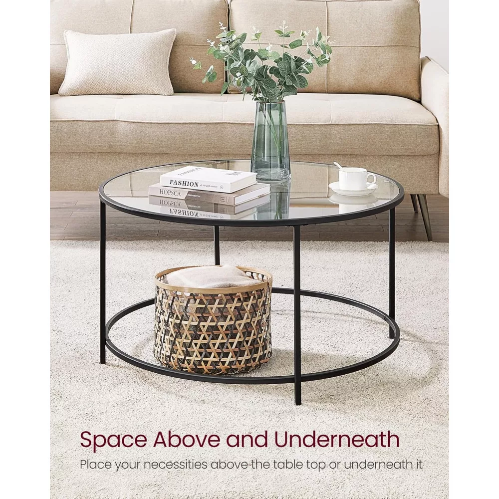 VASAGLE Kerek dohányzóasztal üveglappal, fekete 84x84x45cm