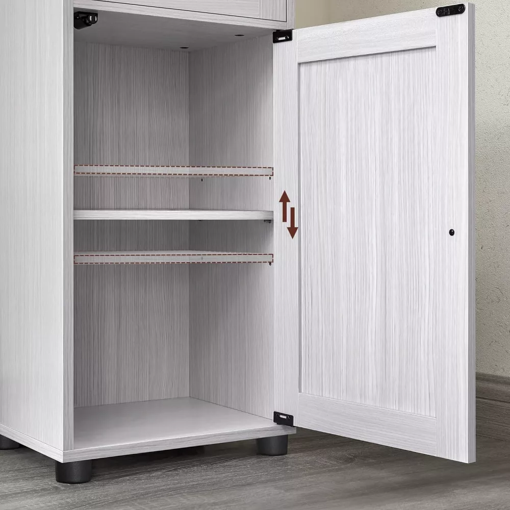 Többféle tárolás - Ez a szekrény nyitott rekeszt kínál a gyakran használt tárgyak számára, egy fiókot a törölközőknek és magasságban állítható polcokat az ajtók mögött, hogy különböző méretű dolgokat tárolhasson!
