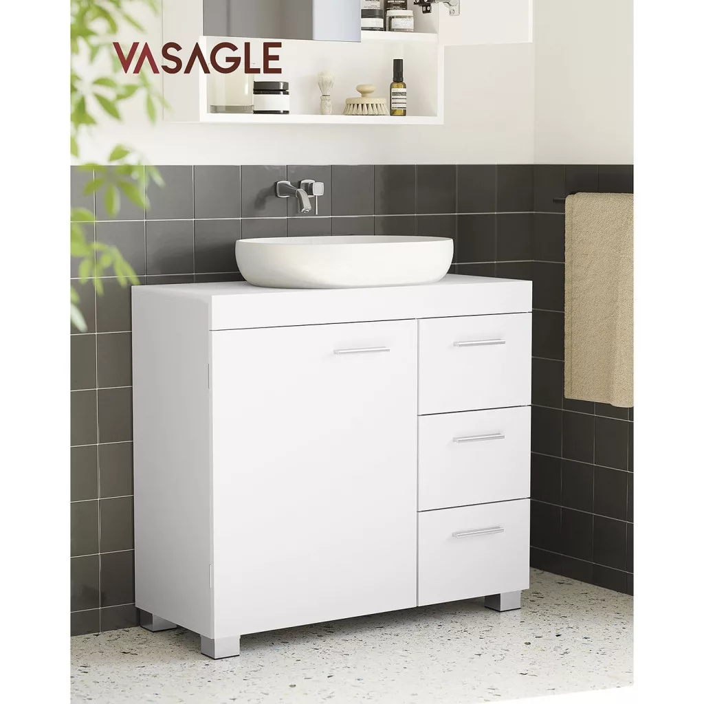 VASAGLE VASAGLE BBK503W10 Fürdőszobai Szekrény 3 Nagy Fiókkal, Fürdőszobai Szekrény, 2 Rekesz az Ajtó Mögött, Fürdőszobai Szekrény Lábakkal, 30 x 70 x 64 cm, Fehér