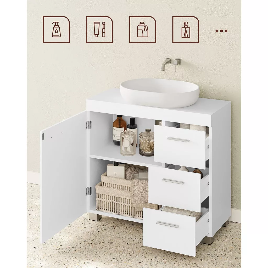 Mosdó alatti fürdőszoba szekrény, 3 fiókos, 1 ajtós, fehér, 70x30x64cm