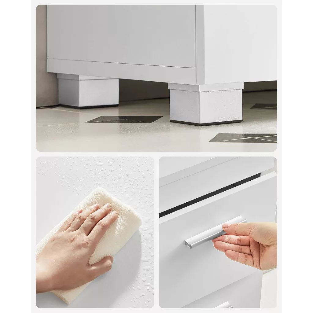 Könnyen ápolható felület és praktikus lábak: a fürdőszobai szekrény felülete könnyen tisztítható, csak egy ruhával kell áttörölni. A lábak megvédik a szekrényt a padlón lévő víztől.