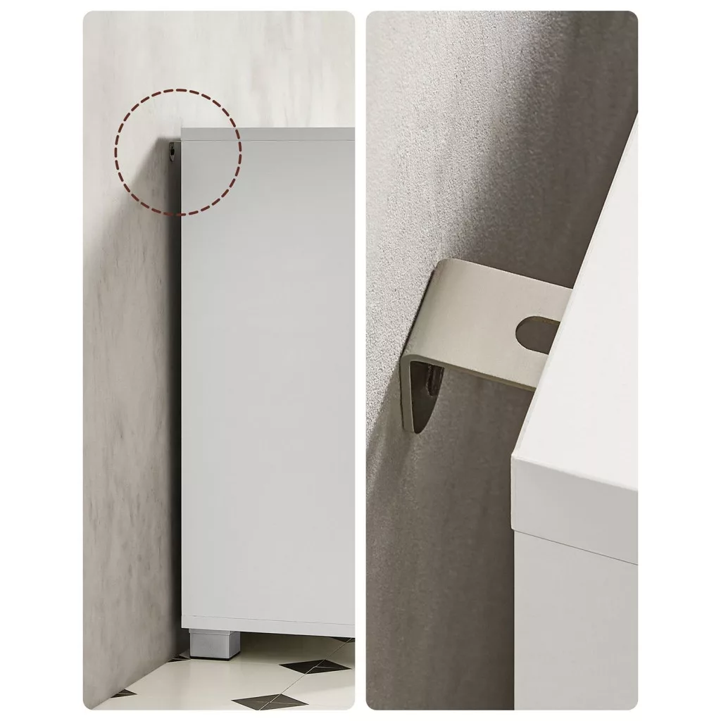 Stabil és tartós: robusztus MDF panelek és a mellékelt dőlésvédelmi elemek jó stabilitást és hosszú élettartamot biztosítanak a fürdőszobai szekrénynek.