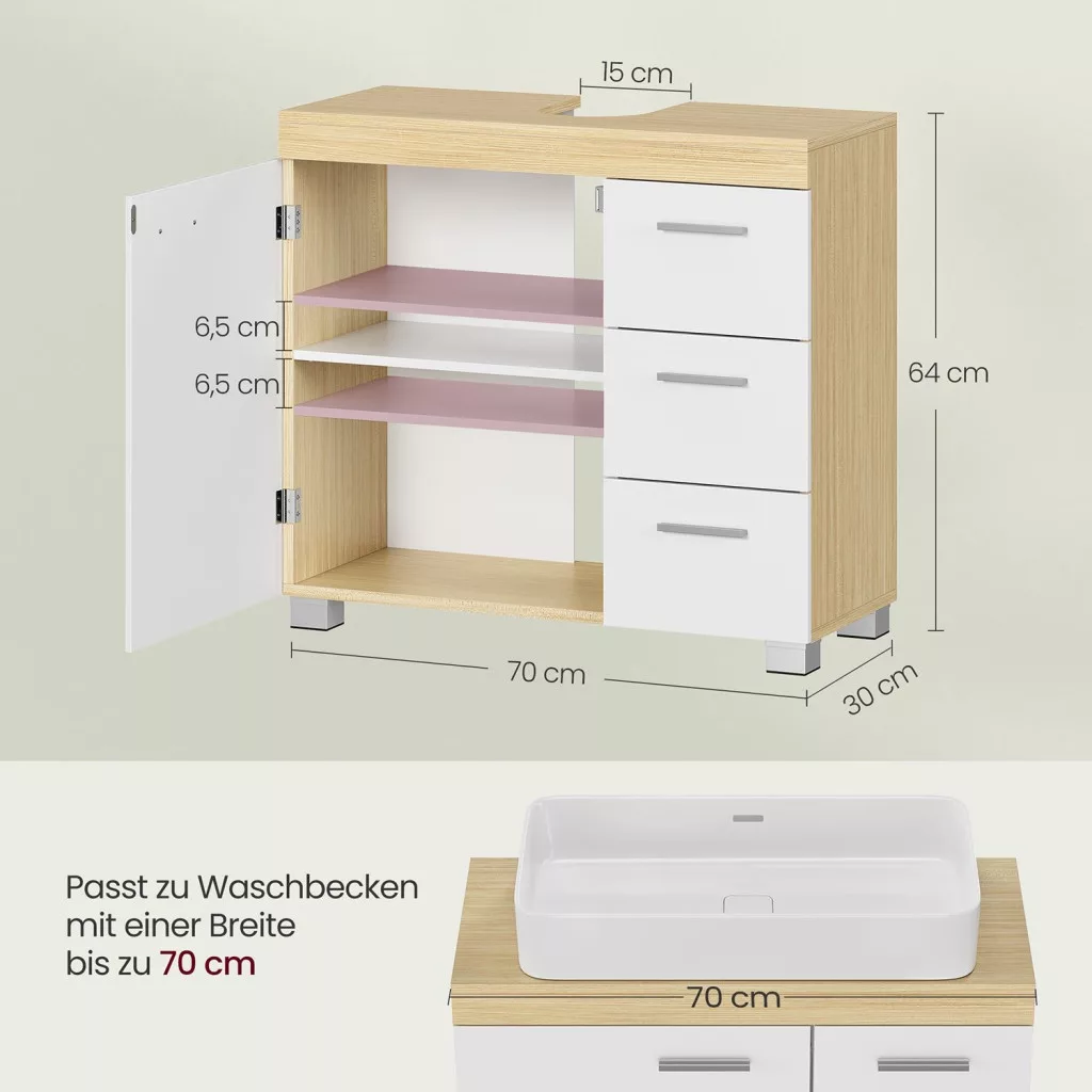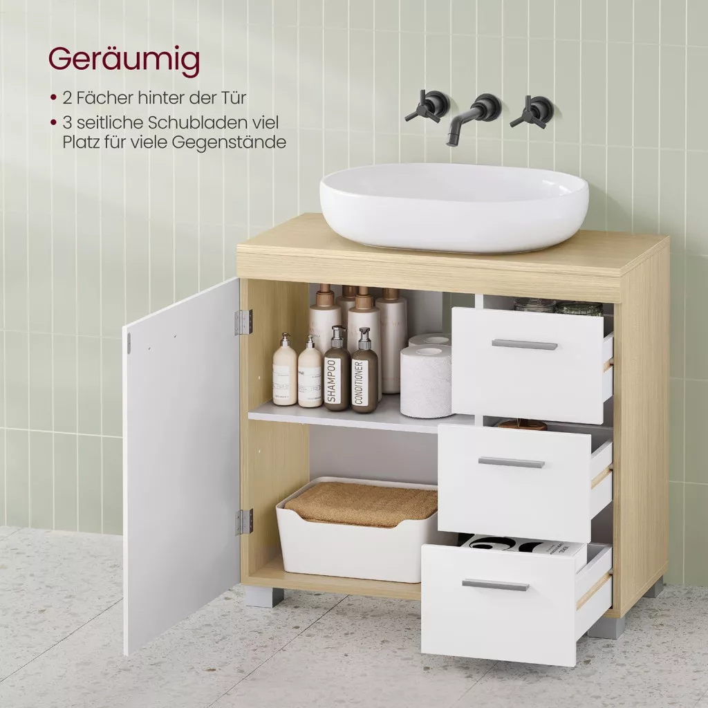 VASAGLE Mosdó alatti fürdőszoba szekrény, 3 fiókos, 1 ajtós, felhő fehér és természetes bézs, 70x30x64cm
