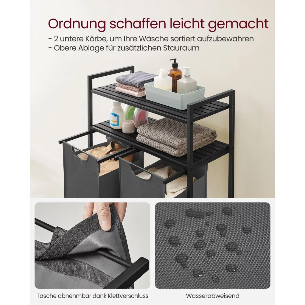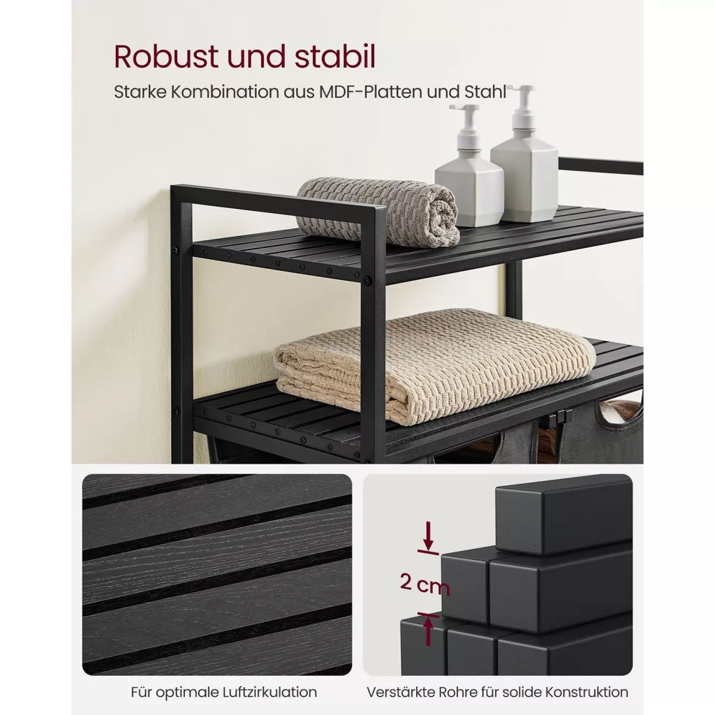 Masszív, erős, tartós: Szilárd 2 x 2 cm-es acélcső, kiváló minőségű MDF lapok - a szennyes válogató masszív és tartós (polconként akár 20 kg-ig). A zsákok vízlepergető Oxford szövetből készültek. A 4 állítható láb növeli a stabilitást.