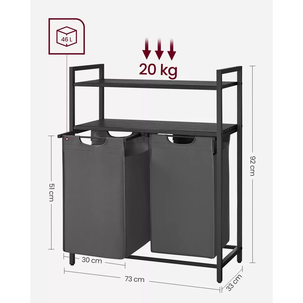 VASAGLE Szennyestartó, polccal kihúzható és levehető ruhatartó zsákkal 2x46L, fekete-szürke
